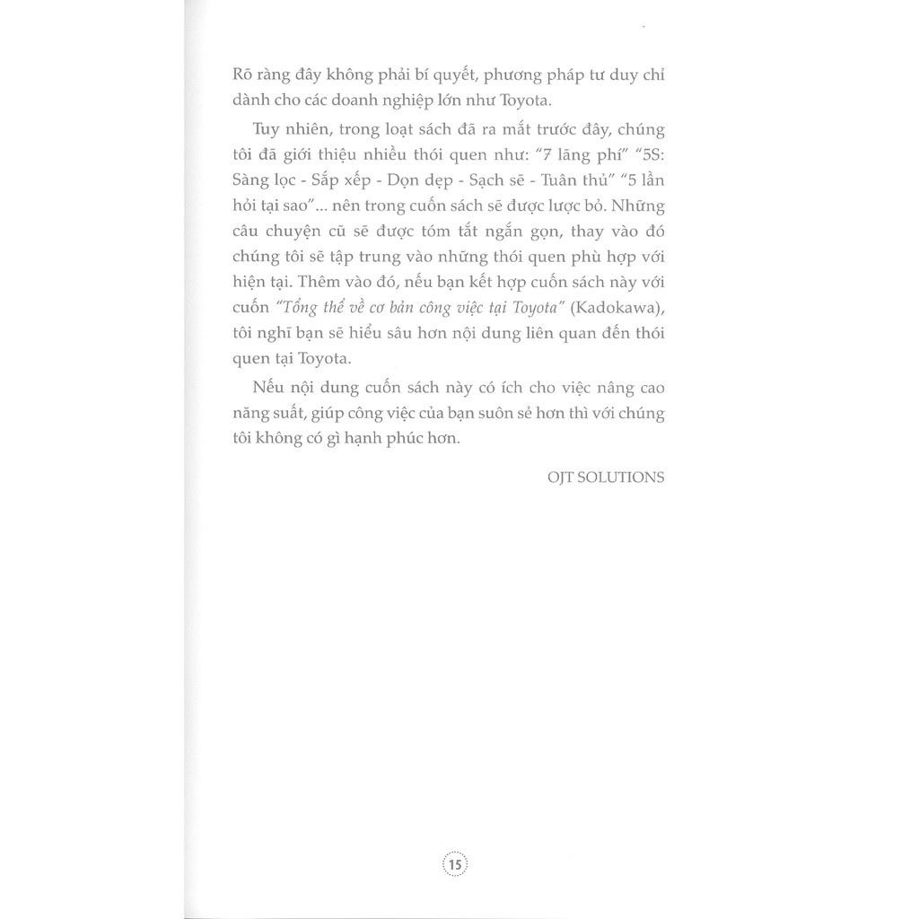 Cuốn sách "Những thói quen tại Toyota" mà tôi sẽ giới thiệu trong cuốn sách này không chỉ được áp dụng tại Toyota. Đây là những nguyên lý - nguyên tắc có tính phổ biến có thể áp dụng bất kể ngành nghề hay bất kỳ doanh nghiệp nào.