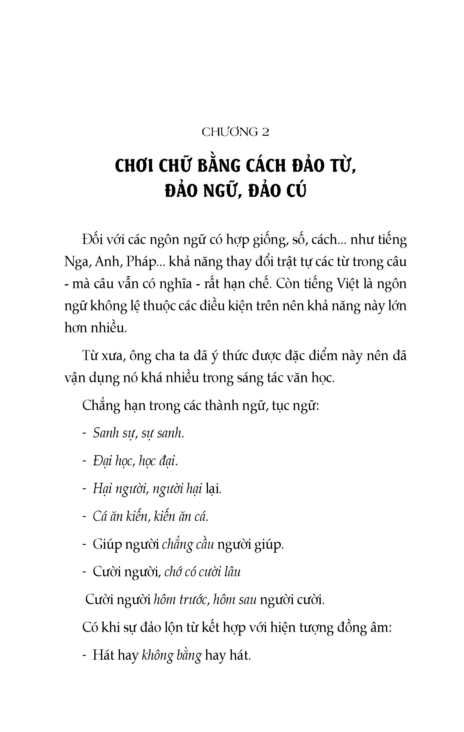 Trong quyển sách này, chúng tôi đã chọn lọc và sắp xếp có hệ thống các trường hợp chơi chữ đắt giá nhất, lấy từ tác phẩm văn học cũng như từ ngôn ngữ hàng ngày. Chúng tôi chia làm 14 kiểu chính, mỗi kiểu xếp thành một chương. Ở mỗi chương, ngoài định nghĩa về kiểu chơi chữ được nêu, chúng tôi tóm tắt những kiến thức cần thiết nhằm giúp bạn đọc dễ tiếp thu và thưởng thức sự thú vị qua các ngữ liệu dẫn ra ở sau. Đối với những ngữ liệu thuộc về hai, ba kiểu chơi chữ, chúng tôi xếp vào hai, ba loại, hoặc chỉ dành chủ yếu cho một kiểu, rồi ghi chú thêm vào những kiểu chơi có liên quan.