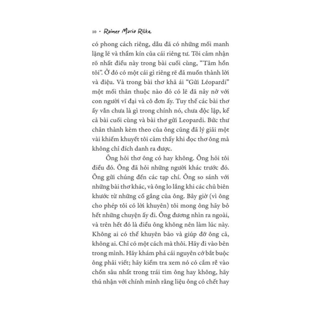 Một trong những nhà thơ lớn nhất của thế kỷ XX Rainer Maria Rilke đã viết cho nhà thơ trẻ Franz Xaver Kappus như thế, để rồi hôm nay những tri kiến quý báu ấy đọng lại trong Thư gửi nhà thơ trẻ. Xuyên suốt tập thư là quan điểm của Rainer Maria Rilke về đời sống cũng như chất liệu nó mang lại cho thi ca: tình yêu, tình dục, nỗi cô đơn, nỗi buồn, nỗi hoài nghi, … Song với đó là những bài thơ tuyển chọn của ông. Và, nếu kẻ cầm bút nào thấy đời sống mình quá tẻ nhạt thì “hãy tự trách mình, tự nhủ mình không đủ chất thi sĩ để gọi lên những phong nhiêu của nó; bởi đối với kẻ sáng tạo thì chẳng có cái gì là nghèo nàn và chẳng có chốn nào là tẻ nhạt, xoàng xĩnh.”