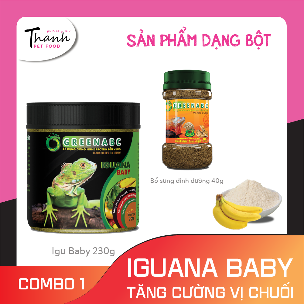 GREENABC - THỨC ĂN IGUANA BABY VỊ CHUỐI - Rồng Nam Mỹ Baby vị Chuối từ mới nở đến 9x.  GREENABC là thức ăn cao cấp dành cho Iguana Baby - Rồng Nam Mỹ Baby Đặc biệt sản phẩm GREENABC được sản xuất theo phương pháp Áp dụng công nghệ PROTEIN bền vững từ bột đạm G.Meal rất giàu PROTEIN – CANXI – LIPID có trong BSFL, đã được Mỹ (AAFCO) và EU chấp nhận đưa vào công thức cho ngành sản xuất thức ăn dành cho vật nuôi. Sản phẩm GREENABC cung cấp các giá trị dinh dưỡng bền vững cho Iguana với sự kết hợp 80% thành phần có nguồn gốc thực vật và 20% thành phần có nguồn gốc động vật từ côn trùng, giúp cho Iguana Baby:      + Lột da thường xuyên, tăng kích cỡ nhanh, lên màu đẹp.      + Với hàm lượng Canxi 100% nguyên chất có trong BSFL giúp gai bung, đều, ngăn ngừa các bệnh thường gặp như teo đuôi, MBD, sạn,      + Kích thích khứu giác, tăng cường vị giác, giúp Iguana ăn ngon miệng hơn. Đặc biệt với hương thơm tự nhiên, Greenabc kích thích khứu giác của các Iguana Abino T-, giúp các bé ăn tốt hơn.       + Tiêu hóa tốt, cơ thể hấp thụ toàn bộ dưỡng chất cần thiết, giúp cơ thể phát triển toàn diện.      + Cơ thể săn chắc, khỏe mạnh.      + Giảm thiểu mùi hôi của phân và cơ thể. Combo 1:  Combo 2:  Combo 3:  Thành phần dinh dưỡng và hướng dẫn sử dụng:  Ghi chú: Khi sử dụng combo Iguana Baby 3, KHÔNG CẦN BỔ SUNG THÊM CANXI VÀ D3 cho Iguana, vì trong combo Iguana Baby 3 đã đầy đủ lượng Canxi cho Igu phát triển. Quý khách hàng sẽ SIÊU TIẾT KIỆM CHI PHÍ cho việc chăm sóc cho Iguana.