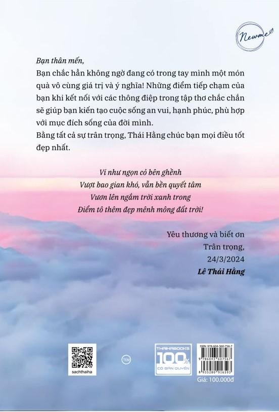 Thông tin tác giả: Nhà thơ Thái Hằng tên gọi đầy đủ là Lê Thái Hằng, sinh năm 1970, hiện đang sinh sống và làm việc tại Canada. Sau bao năm trăn trở ý nghĩa thực sự của kiếp nhân sinh qua những trải nghiệm thăng trầm buồn vui của đời m.ình, năm 2020 nhân duyên đặc biệt đến, nhà thơ có trải nghiệm thức tỉnh tâm linh và dần giải đáp được những trăn trở trong tâm m.ình. Khả năng làm thơ của nhà thơ cũng được khai mở từ đấy.