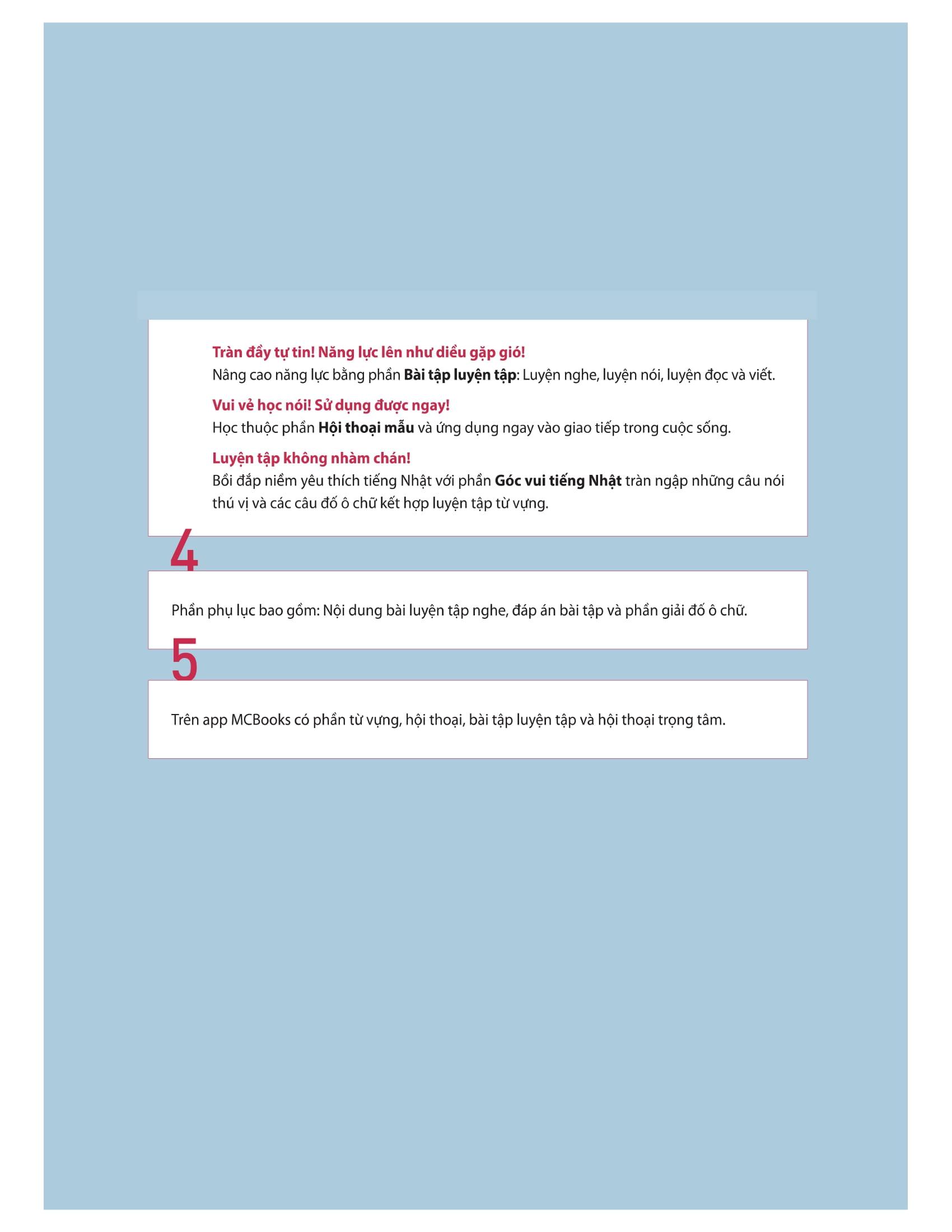 • Góc vui tiếng Nhật – Phần phụ lục bao gồm: Nội dung bài tập luyện nghe, đáp án bài tập và phần giải đố ô chữ – Học cùng ứng dụng trên điện thoại của MCBooks Trên app MCBooks có phần từ vựng hội thoại, bài tập luyện tập và hội thoại trọng tâm. Các bài nghe đều được thực hiện bởi người có phát âm tiếng Nhật chuẩn, qua đó các bạn nâng cao được kỹ năng nghe một cách nhanh nhất. Để tiện lợi hơn trong quá trình học tập, giúp bạn tận dụng mọi khoảng thời gian trống để ôn lại các bài nghe, với “Tiếng Nhật thật đơn giản trong giao tiếp hàng ngày”, chỉ cần tải app của MCBooks quét mã QR code ở sau cuốn sách. Bạn có thể sở hữu cuốn sách ngay trong điện thoại của mình. Hệ thống hỗ trợ trên cả hai hệ điều hành Android và IOS. Hãy thưởng thức công nghệ trong một cuốn sách tuyệt vời. Chắc chắn cuốn sách này sẽ là bạn đồng hành không thể thiếu trên cung đường học tiếng Trung của bạn. Với cách trình bày khoa học, phương pháp gần gũi, chỉ cần bỏ ra 30 phút mỗi ngày là bạn đã có thể nắm trọn được giao tiếp tiếng Nhật cơ bản. Dù bận rộn đến mấy chỉ cần kiên trì chắc chắn bạn sẽ đạt được mục tiêu đã đề ra.