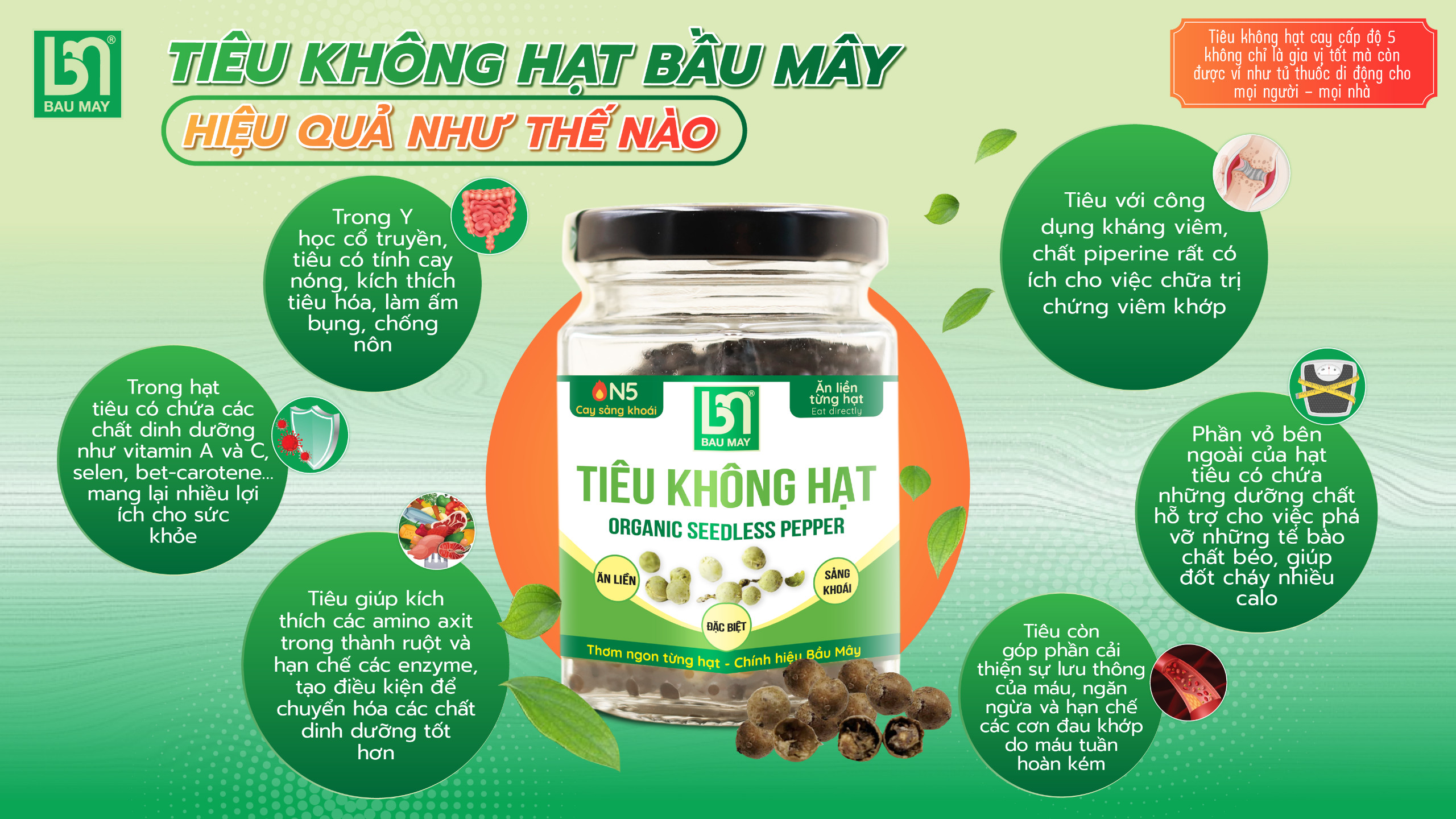 Tiêu là vua của gia vị, trong tiêu có nhiều thành phần như Vitamin, tinh dầu, piperin, chất béo, tinh bột, chanvixin, … đặc biệt piperin hạn chế oxy hóa, bảo vệ gan, hạn chế viêm, hạn chế ung thư, trầm cảm, giảm đau. Việc ăn liền từng hạt tiêu mà không cần giã, không cần rang, không cần xay, khi ăn liền cùng thức ăn giúp ăn ngon hơn, lại tốt việc ăn uống, tiêu hóa tốt, bổ sung sức đề kháng, thải độc tố, kháng khuẩn,…