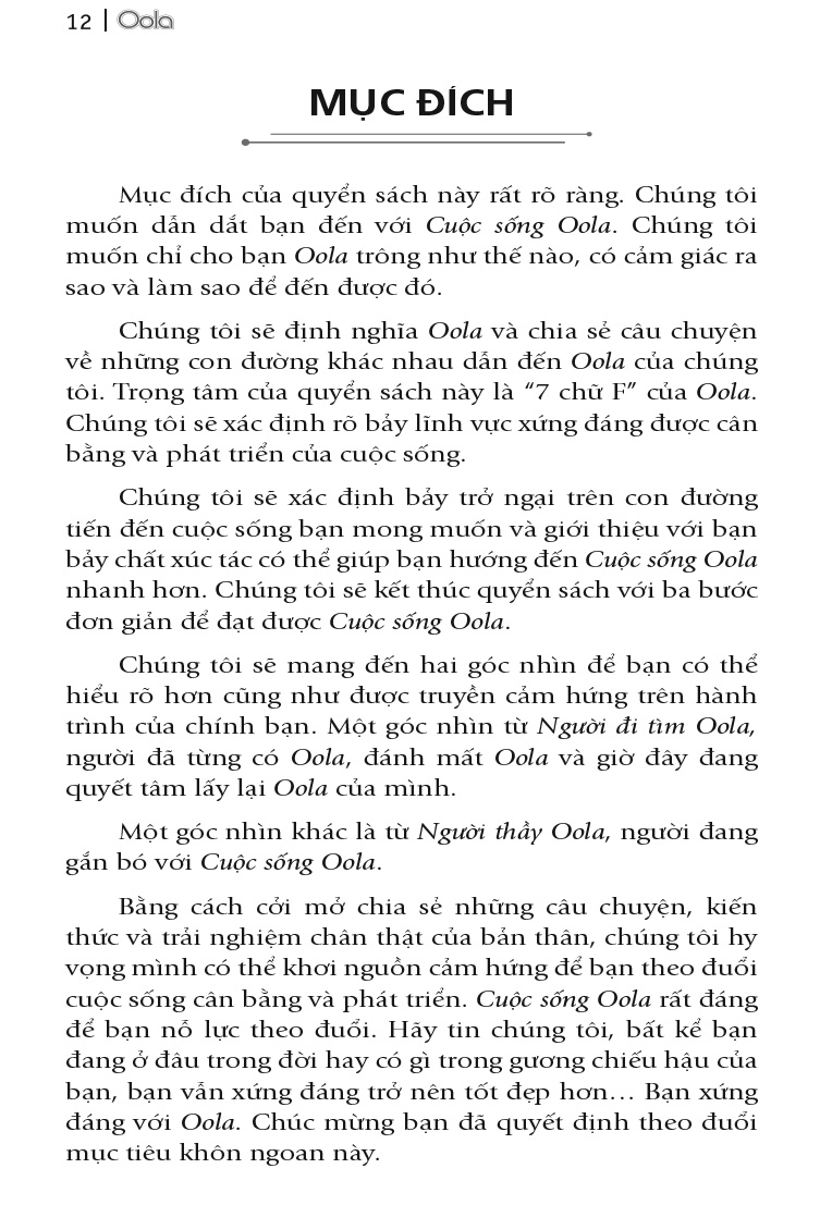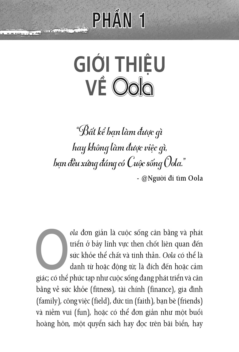 Cuốn sách “Oola – Tìm bình yên giữa vạn biến” đã định nghĩa lại thế nào là một cuộc sống tuyệt vời mà bất cứ ai trong chúng ta cũng khao khát và tìm cách đạt được nó. Đó là cuộc sống cân bằng, mãn nguyện về sức khỏe (fitness), tài chính (finance), gia đình (family), công việc (field), đức tin (faith), bạn bè (friends) và niềm vui (fun).