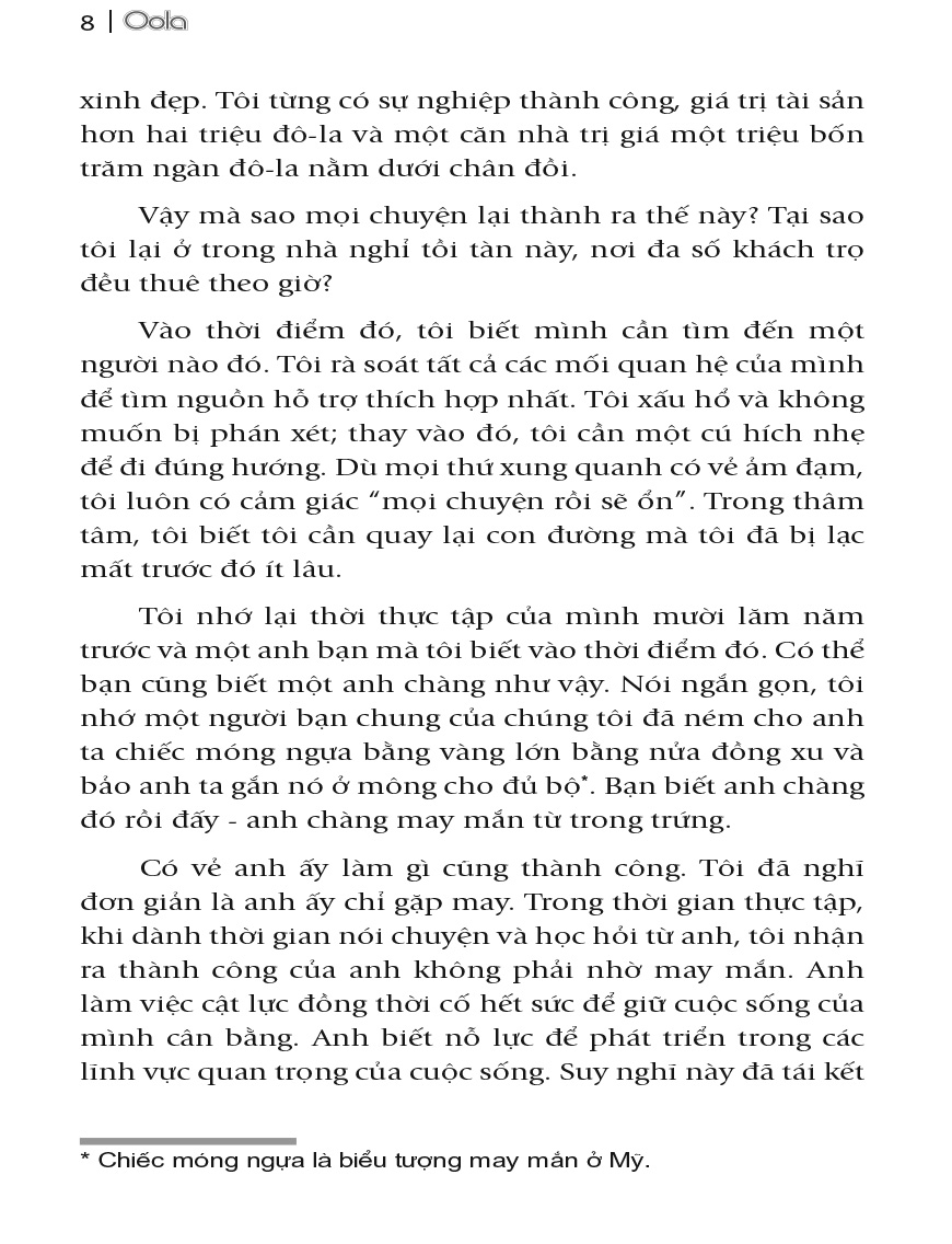 Không phải là những lời khuyên sáo rỗng, “Oola Tìm bình yên giữa vạn biến” chứa đựng những mẩu truyện nhỏ khiến bạn có thể ngạc nhiên “à ra thế” và cùng một loạt những lời khuyên thực tế mà bạn có thể chuyển hóa ngay thành hành động hoặc thói quen.
