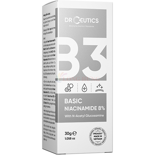 Tinh chất DrCeutics Basic Niacinamide 8% Thành phần: Niacinamide: Tạo hàng rào lipid, điều tiết dầu, hỗ trợ làm giảm và cải thiện tình trạng mụn. Bảo vệ khỏi tác hại của ánh nắng mặt