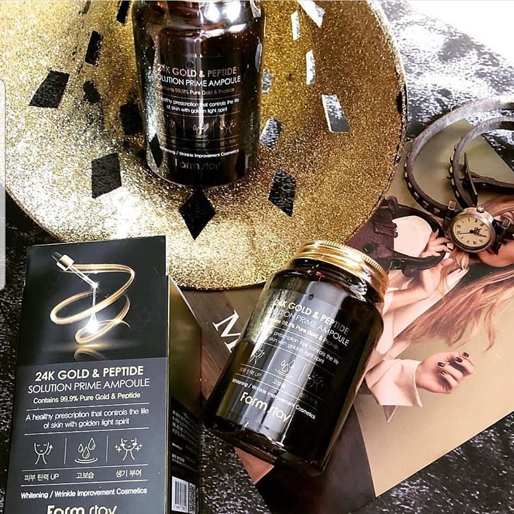 Tinh chất chống lão hóa FarmStay 24k Gold & Peptide Perfect Ampoule 250ml cung cấp một lượng tinh chất vàng 24k và Peptide giúp tái tạo da, cải thiện nếp nhăn, giảm chảy xệ, tăng độ đàn hồi. Thúc đẩy các tế bào hoạt động khỏe mạnh và quá trình tái tạo tế bào diễn ra mạnh mẽ hơn, nhanh chóng đào thải các tế bào có chứa Melanin, làm da sáng hơn. Những giọt serum đậm đặc óng ánh khi thoa lên da sẽ dần thấm sâu giúp chăm sóc da toàn diện.