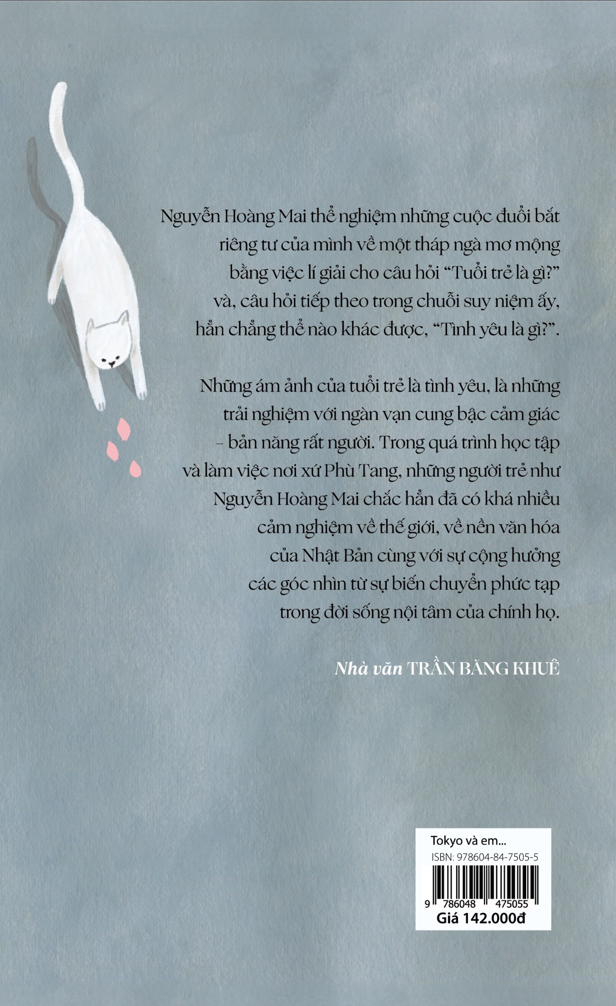 Tác giả: Nguyễn Hoàng Mai Nguyễn Hoàng Mai thể nghiệm những cuộc đuổi bắt riêng tư của mình về một tháp ngà mơ mộng bằng việc lí giải cho câu hỏi "Tuổi trẻ là gì?" và, câu hỏi tiếp theo trong chuỗi suy niệm ấy, hẳn chẳng thể nào khác được, "Tình yêu là gì?" Những ám ảnh của tuổi trẻ là tình yêu, là những trải nghiệm với ngàn vạn cung bậc cảm giác bản năng rất người. Trong quá trình học tập và làm việc nơi xứ Phù Tang, những người trẻ như Nguyễn Hoàng Mai chắc hẳn đã có khá nhiều cảm nghiệm về thế giới, về nền văn hóa của Nhật Bản cùng với sự cộng hưởng các góc nhìn từ sự biến chuyển phức tạp trong đời sống nội tâm của chính họ. Nhà văn TRẦN BĂNG KHUÊ