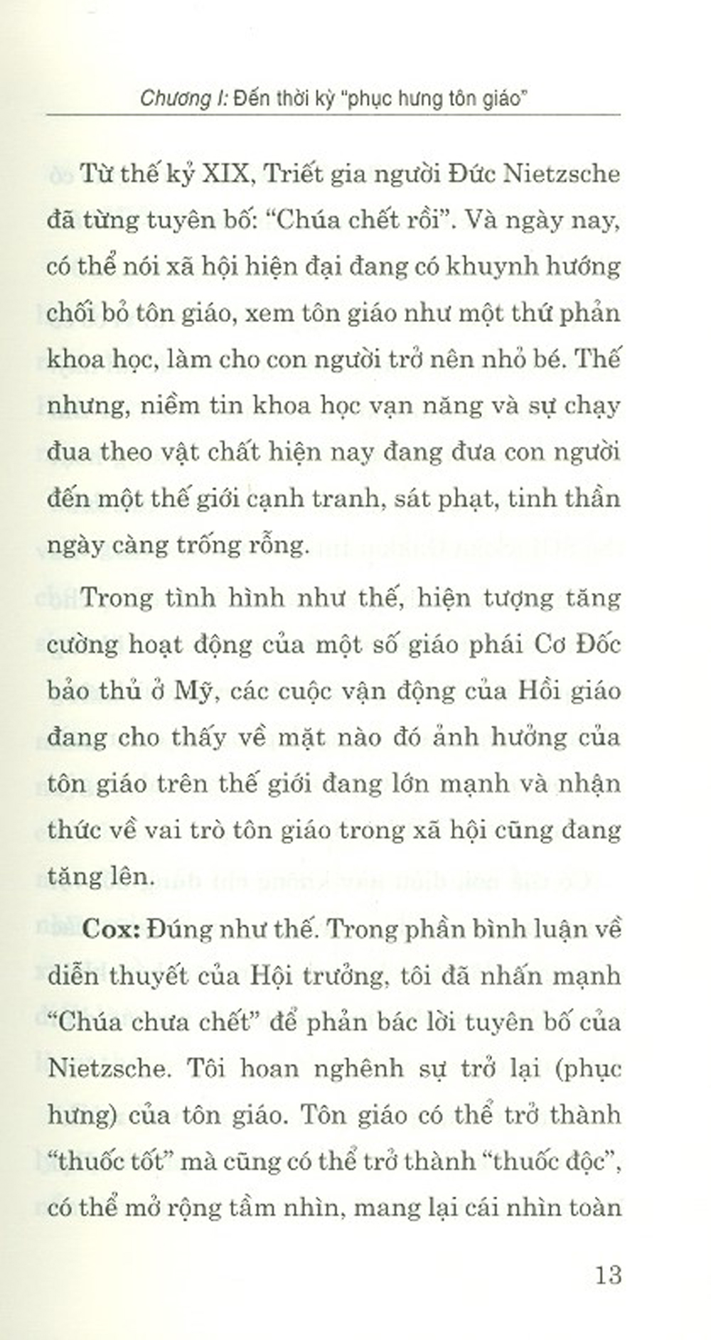 Nội dung cuốn sách được trình bày dưới hình thức một cuộc đối thoại cởi mở và đầy trách nhiệm giữa Tiến sĩ tôn giáo học Harvey G.Cox – chuyên gia nghiên cứu hàng đầu người Mỹ về vấn đề tôn giáo – văn hóa – chính trị và Tiến sĩ Ikeda Daisaku – học giả uyên bác về nhiều lĩnh vực khoa học, nhà văn hóa nổi tiếng ở Nhật Bản cũng như trên thế giới.