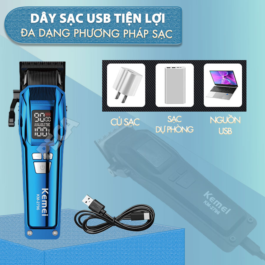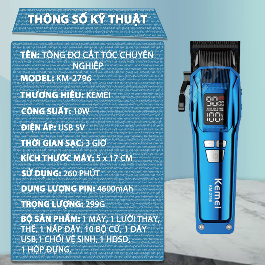 TÔNG ĐƠ CẮT TÓC CHUYÊN NGHIỆP KEMEI KM-2796 CÔNG SUẤT MẠNH 10W ĐIỀU CHỈNH 5 MỨC TỐC ĐỘ, CÓ ĐỘNG CƠ KHÔNG CHỔI THAN, MÀN HÌNH LCD HIỂN THỊ SẠC, LƯỠI CẮT MẠ CARBON DLC CAO CẤP