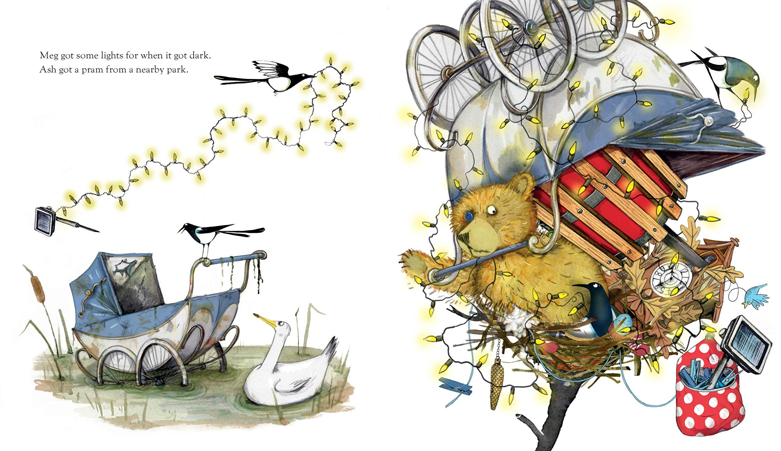 Meg and Ash are a pair of magpies who are building a nest for their perfect eggs. Although they begin their nest construction using the usual mud, sticks and grass, Meg and Ash are soon convinced that their nest doesn’t have enough stuff and begin to collect more things to add to an ever-growing pile. From cuckoo clocks to mops and socks, a pram and even a car – their need for stuff seems endless. Until – crash! – the inevitable happens.