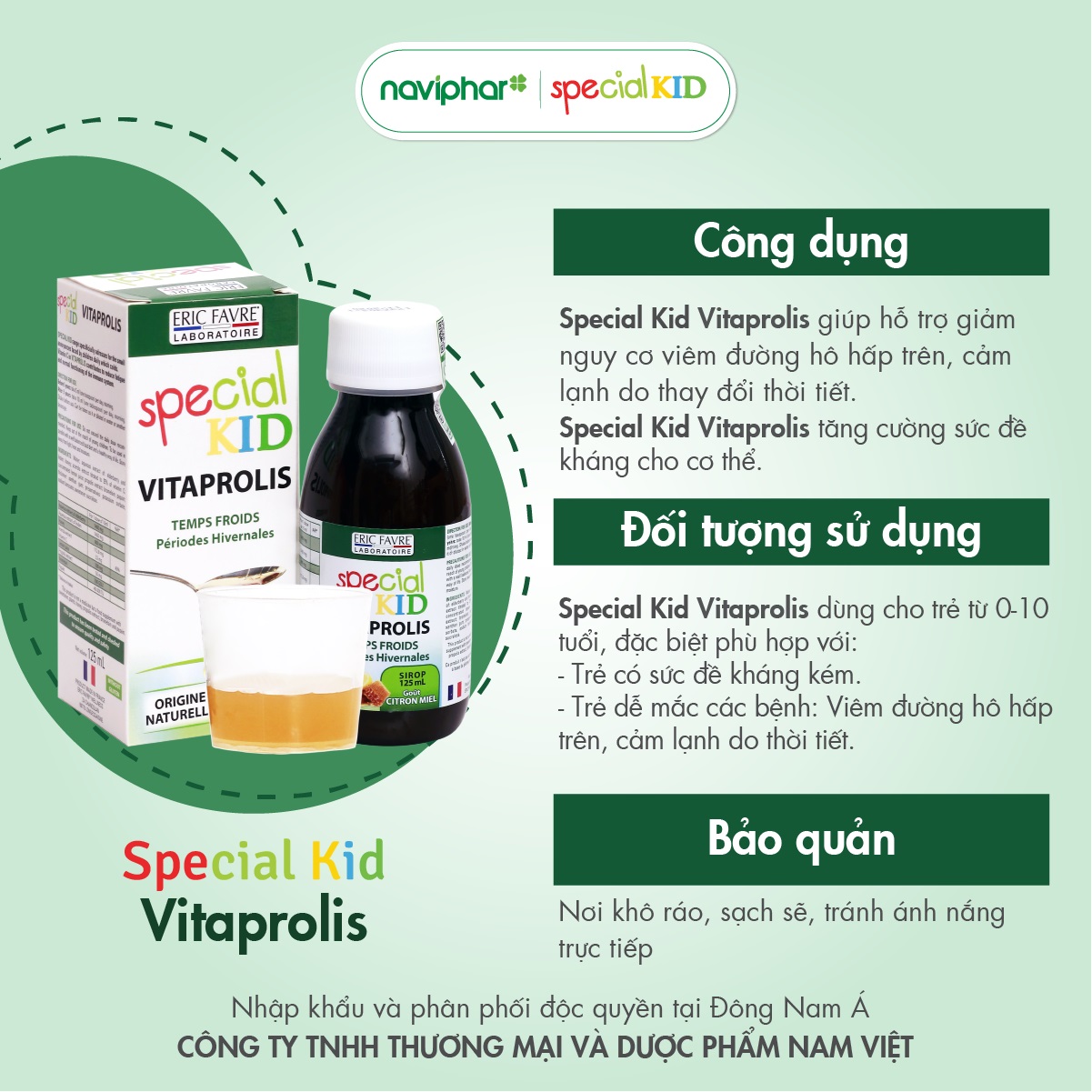 Special Kid là thương hiệu nhập khẩu nguyên hộp từ Pháp, đáp ứng hầu hết nhu cầu phòng và hỗ trợ điều trị các bệnh thường gặp của trẻ trong những năm tháng đầu đời. Special Kid Vitaprolis được bào chế chuyên biệt dành cho trẻ em, mùi vị dễ chịu, chỉ cần sử dụng 1 lần/ngày. Tiết kiệm. Dễ nhớ