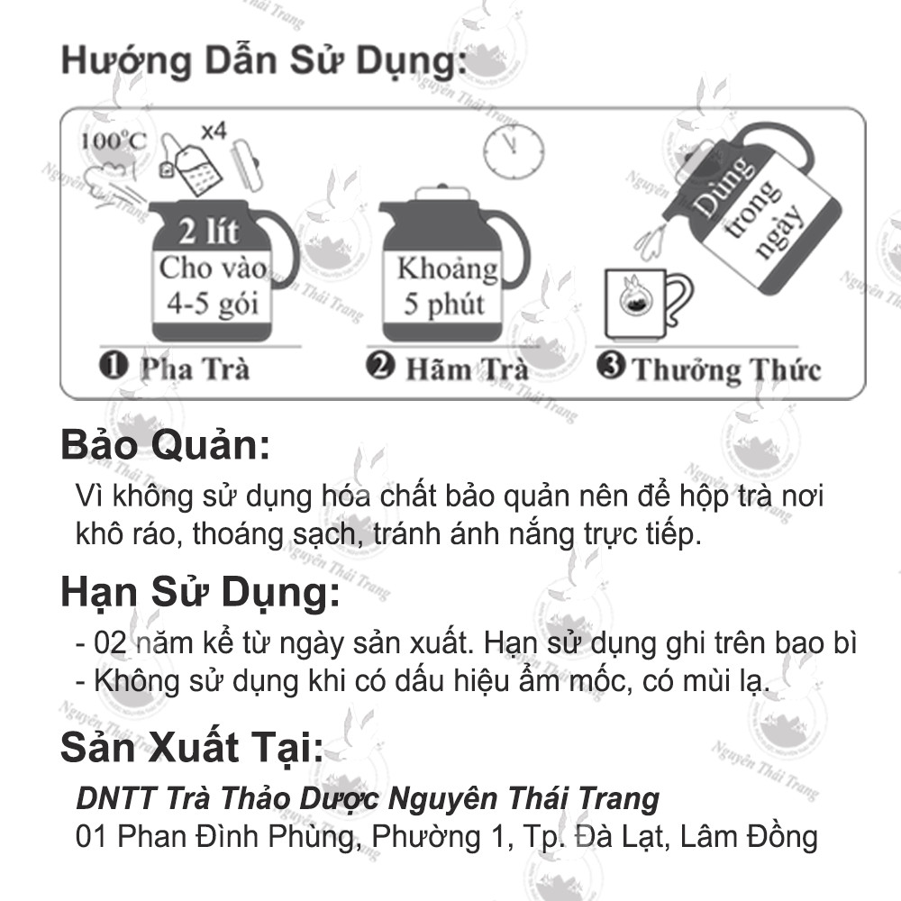 Sản Phẩm khi dùng sẽ có chút “ bột thuốc” trong nước. Do trà được sản xuất từ các loại thảo dược trong đó nhiều vị thuốc khi bào chế sẽ tạo thành bột mịn, loại bỏ sẽ làm giảm tác dụng của trà. Sau khi hãm, Bạn có thể để lắng hoặc lọc bỏ cặn sau đó dùng.