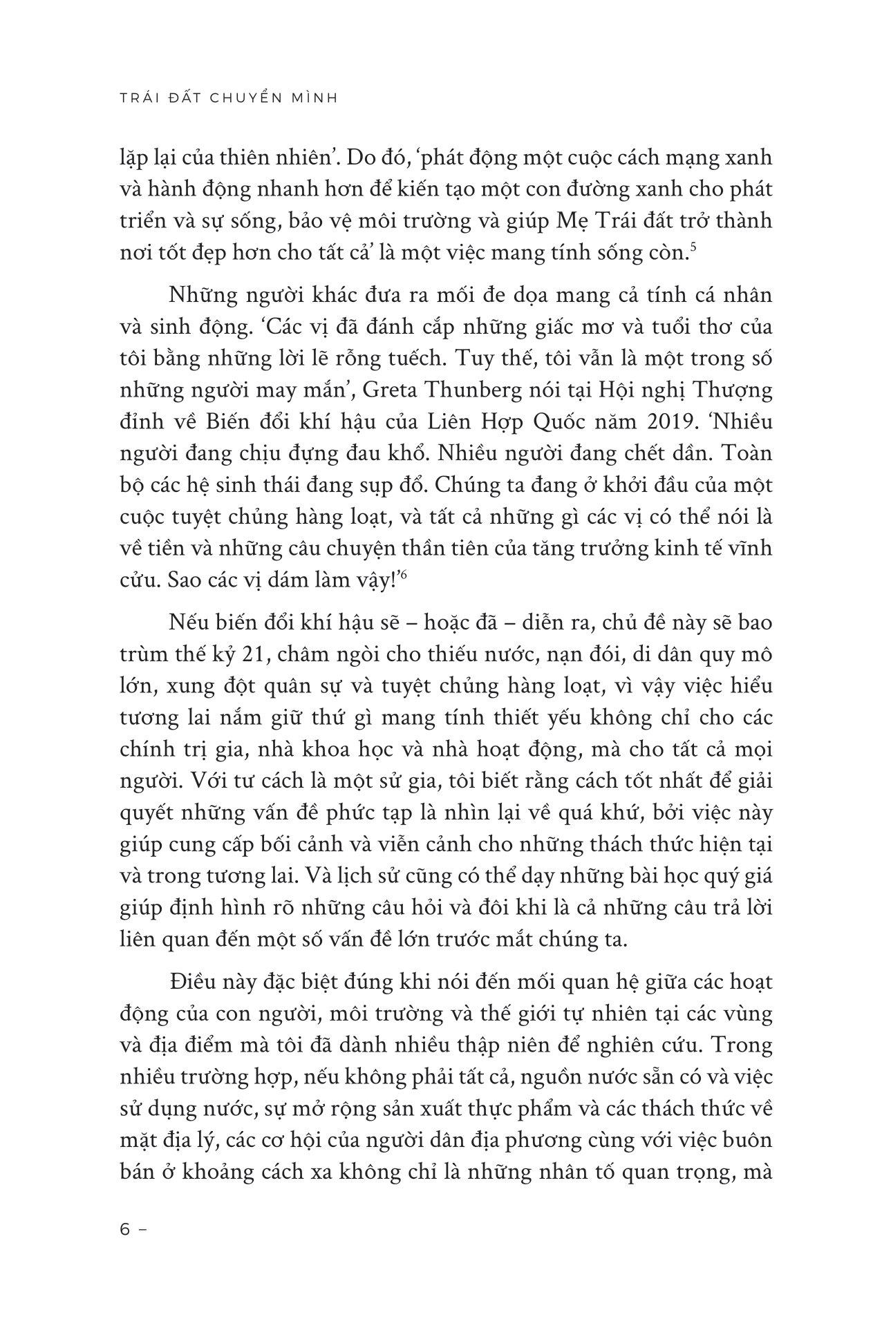 - Cuốn sách này không nói về những gì sẽ diễn ra trong tương lai. Mục đích của nó không phải để thách thức những tiếng nói đồng thanh mang tính áp đảo của cộng đồng khoa học, cũng không tập trung vào các điều kiện toàn cầu hiện tại hay xem xét những bước đi nào có thể giảm thiểu một số hoặc thậm chí là nhiều vấn đề tồi tệ nhất do biến đổi khí hậu đặt ra, dẫu là qua sự thích nghi hay giới thiệu những công nghệ mới. Thay vào đó, mục đích của nó là xem xét quá khứ, hiểu và giải thích chúng ta đã ở vào vị thế mà nay có vẻ thật hiểm nghèo như thế nào. Ban đầu, tôi nghĩ m.ình sẽ chỉ viết về lịch sử, rằng khí hậu đã định hình thế giới quanh ta như thế nào, và về những chiều hướng mà những biến chuyển trong nhiệt độ toàn cầu, lượng mưa và mực nước biển – cùng những hiện tượng cực đoan, như siêu bão, núi lửa phun trào và va chạm thiên thạch – đã ảnh hưởng lên quá khứ, sắp đặt nên những khoảnh khắc, những thời kỳ và bối cảnh giải thích vai trò quan trọng đến nhường nào của khí hậu trong lịch sử thế giới. Tuy nhiên, mọi sự rất sớm rõ ràng khi tôi bắt đầu nghĩ về một cuốn sách sẽ mở ra cánh cửa với khí hậu, với những thay đổi trong các kiểu quy luật thời tiết và với tác động của con người lên thế giới tự nhiên, nó sẽ dẫn tới một loạt câu hỏi và thách thức lớn hơn rất nhiều về mối quan hệ giữa dư thừa nông nghiệp và sự ra đời của nhà nước quan liêu; về mối liên quan giữa một bên là những người mục súc, du mục và bên kia là xã hội định canh định cư trong những ngôi làng, thị trấn và thành phố; về vai trò và sự phát triển của tôn giáo và các hệ thống tín ngưỡng như một hàm số của khí hậu, môi trường và địa lý; về c.hủng tộc và chế độ nô lệ, và vai trò của chúng trong quá trình khai thác các tài nguyên; về sự mở rộng của lương thực, mầm bệnh và bệnh tật; về chế độ dân chủ, nghèo đói và các mô hình tiêu thụ trong nhiều thế kỷ kể từ cách mạng công nghiệp; về toàn cầu hóa, tiêu chuẩn hóa của công nghiệp, nông nghiệp, lương thực và thời trang trong thế kỷ gần đây nhất; về nguyên do thế kỷ 21 rơi vào thời khắc khủng hoảng. Do đó cuốn sách này có ba mục đích. Thứ nhất là đưa khí hậu vào trong câu chuyện của quá khứ như một chủ đề cơ sở, mang tính cốt yếu và hay bị bỏ qua trong lịch sử toàn cầu, từ đó cho thấy ở đâu, khi nào và như thế nào mà thời tiết, các mô hình khí hậu kéo dài và những thay đổi trong khí hậu – do con người và do các nguyên nhân khác – lại có tác động to lớn đến thế giới. Thứ hai là trình bày câu chuyện về tác động của con người với thế giới tự nhiên qua nhiều thiên niên kỷ và xem xét cách thức loài người chúng ta khai thác, nhào nặn và uốn nắn môi trường theo ý chí của m.ình, cả mặt tốt lẫn mặt xấu. Và thứ ba là mở rộng tầm nhìn của chúng ta về lịch sử. Nghiên cứu về quá khứ từng bị thống trị bởi sự chú ý dành cho ‘thế giới phương bắc’, là những xã hội giàu có của châu Âu và Bắc Mỹ, còn lịch sử của các châu lục và khu vực khác thường bị xếp vào mức độ quan trọng thứ yếu hoặc bỏ qua hoàn toàn. Chính kiểu mẫu này cũng được áp dụng cho khoa học khí hậu và nghiên cứu về lịch sử khí hậu, nơi những khu vực rộng lớn, giai đoạn và con người nhận được ít sự chú ý, nghiên cứu hay đầu tư – nó nói lên nhiều điều về những quan điểm đã được chấp nhận từ lâu về quá khứ cũng như thực tế phát triển và hoạt động đào sâu vào thực tiễn của các quỹ học thuật (và các trung tâm trí thức). Nếu những điểm trên hướng đến một lý do căn bản để đánh giá lại lịch sử, thì sự nhấn mạnh quá mức của các sử gia rằng các thị trấn, thành phố và quốc gia giống nhau về sự lãnh đạo, bộ máy quan liêu và hành vi cũng cần như vậy. Thực vậy, bản thân từ ‘nền văn minh’ về nghĩa đen để chỉ đời sống của các thành phố, của những người sống trong nó và người phóng chiếu quyền lực và cai trị nó. Điều này được phản ánh trong hầu hết các tư liệu viết mang tính lịch sử – các bài tường thuật, các ghi chép về bán đất, các hóa đơn thuế, – phục vụ cho việc củng cố sự cai trị theo tôn ti thứ bậc. Rất nhiều nội dung lịch sử được viết bởi những người sống ở các thành phố, cho những người sống ở thành phố, và tập trung vào đời sống của những người sống ở thành phố. Việc đó làm lệch đi cách ta xem xét quá khứ và thế giới quanh m.ình. - Trích trang 28