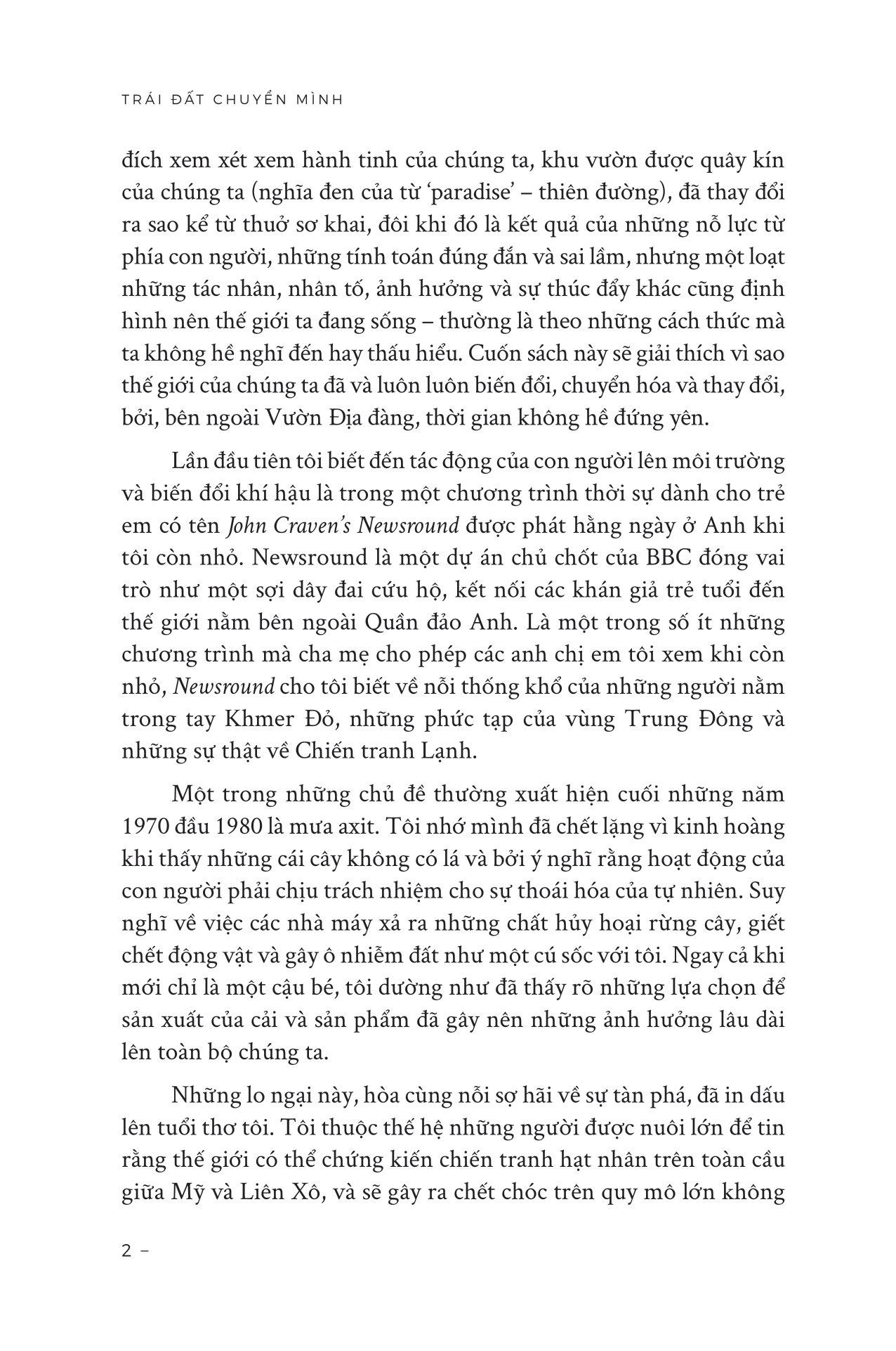 - Một bài học nhân loại đã lãng quên Cuốn sách đã làm rất tốt việc thể hiện một cách rõ ràng tầm quan trọng của các kiểu khí hậu, môi trường và thời tiết trong việc ảnh hưởng đến tiến trình lịch sử loài người. Khi làm như vậy, nó đã thành công đưa chúng ta trở lại vị trí của tổ tiên hàng nghìn năm trước, những người biết rằng sự sống còn bấp bênh của họ phụ thuộc vào việc quản lý mối quan hệ của họ với môi trường. Đó là một bài học mà con người dường như đã lãng quên. Nhưng như cuốn sách của Frankopan đã chỉ ra, đôi khi chỉ cần một thảm họa thiên nhiên lớn, như thiên thạch va chạm hay đại hồng thủy - những sự kiện có thể đã bị quên lãng trong tâm trí con người, nhưng từng diễn ra suốt thời gian tồn tại của hành tinh – đều có thể biến mọi thứ thành tro bụi." Thế giới của chúng ta luôn là một thế giới của biến chuyển, tiếp nối và thay đổi. Từ vụ nổ Big Bang cho đến ngày nay, hoạt động của mặt trời, núi lửa phun trào, lũ lụt và hạn hán đã định hình nên lịch sử tự nhiên và lịch sử loài người. Những cách thức tương tác giữa chúng ta và Trái đất đã mang lại những lợi ích to lớn – nhưng thường phải trả giá. Khi chúng ta đối mặt với một tương lai bấp bênh, việc học những bài học từ quá khứ chưa bao giờ quan trọng hơn. THÔNG TIN TÁC GIẢ: Peter Frankopan