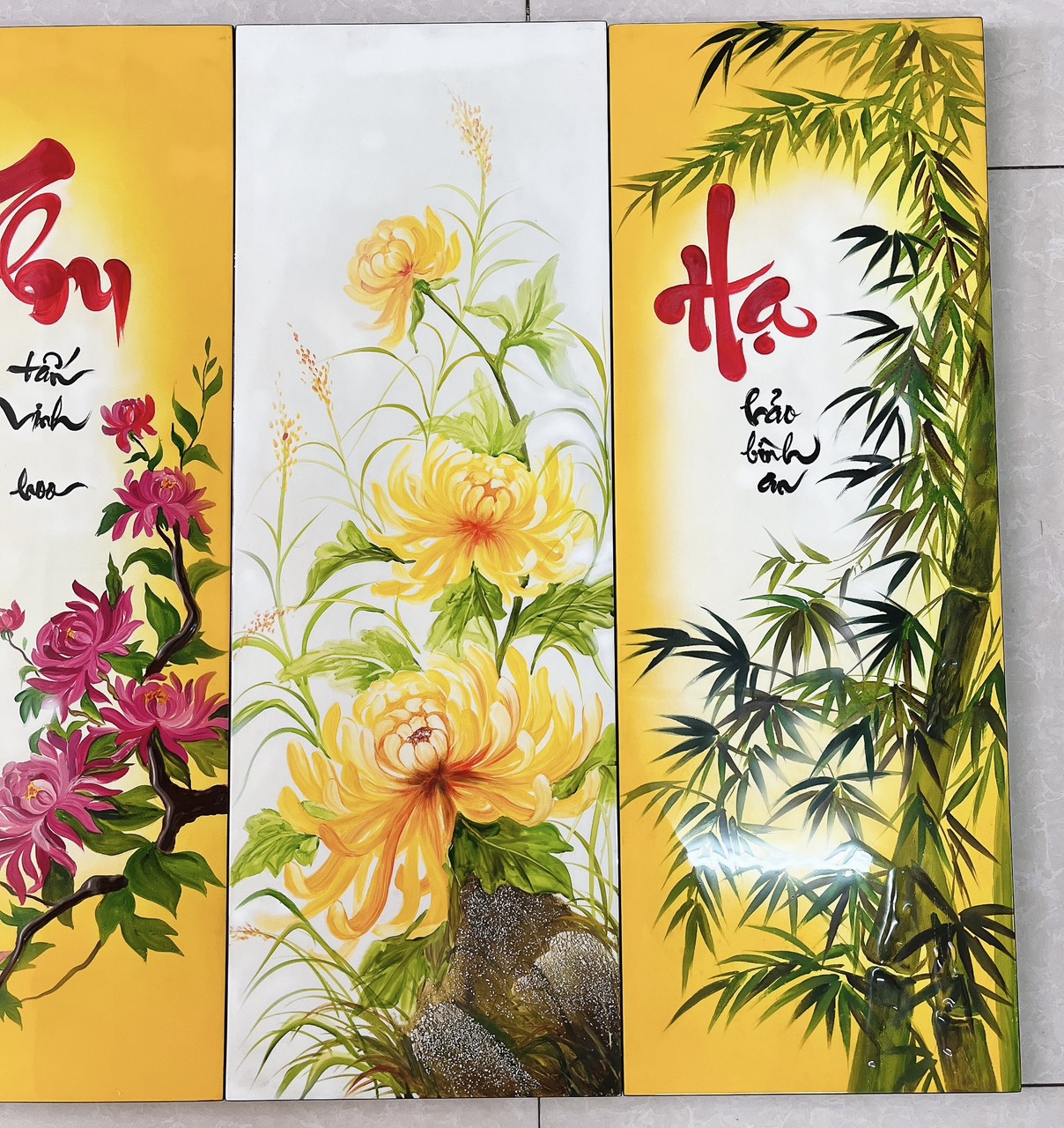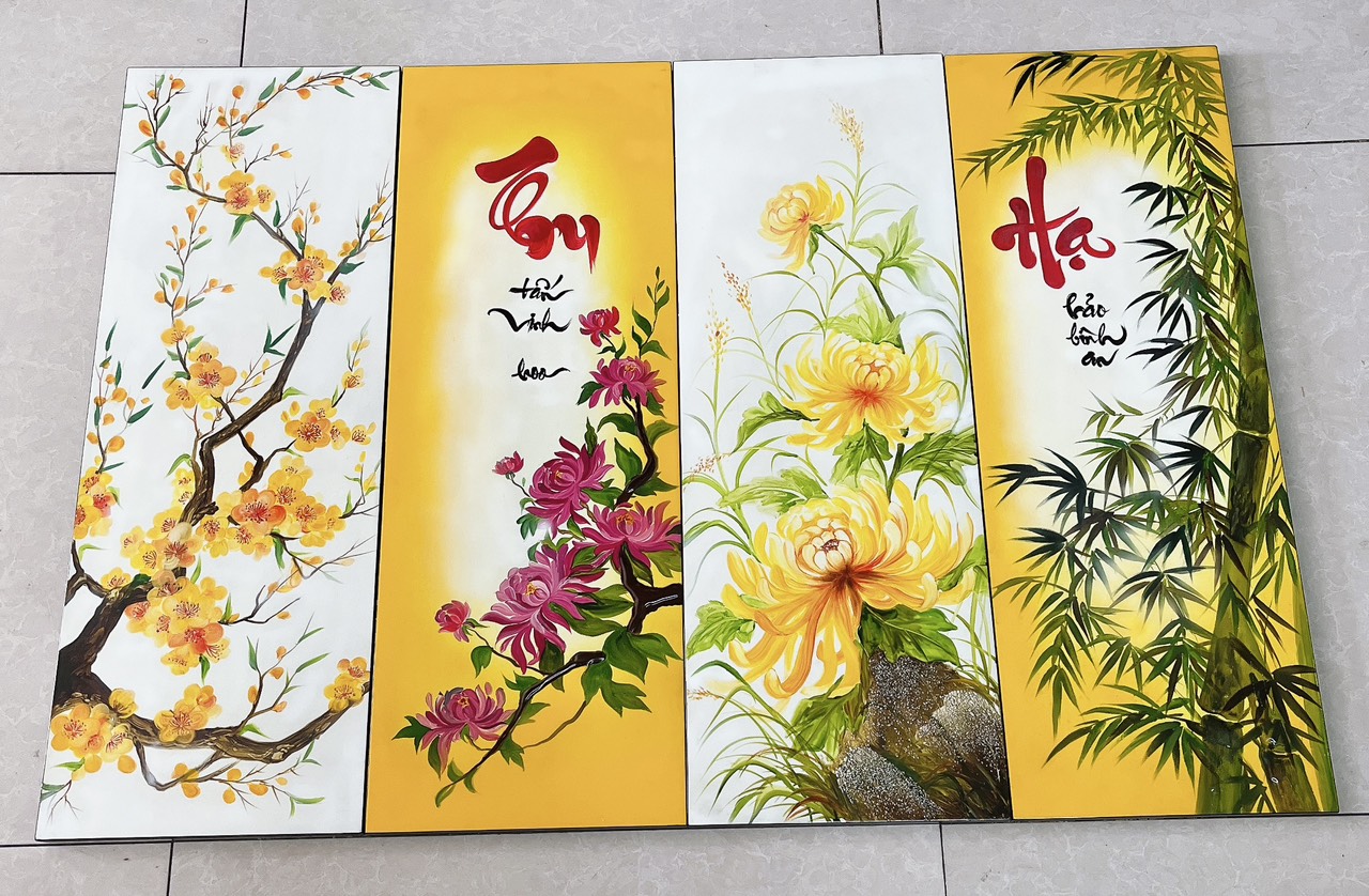 - Hoa mai: Loài ho biểu tượng của mùa xuân mà chắc chắn không ai là không biết. Mai tượng trưng cho sự thanh khiết cao thượng, vinh hiển cao sang. Thấy mai đơm bông, nẩy lộc là thấy mùa xuân đã về đem theo giàu sang, tình cảm, tấn lộc tấn tài. +Hoa cúc: Được xem là biểu tượng của mùa thu. Cúc chính là loài hoa tượng trưng cho sự trường thọ cùng phúc lộc dồi dào. Đây cũng là loài hoa giúp mang lại những nguồn năng lượng tích cực để giúp gia chủ có được nhiều may mắn và thuận lợi trong cuộc sống +Cây trúc: Trong bộ tranh này thì cây trúc là đại diện cho mùa hạ. Loài cây này chính là biểu tượng lớn nhất cho sự trường thọ cùng tính kiên cường để vượt qua mọi chông gai, sóng gió. Đặc biệt, trong phong thủy thì đây còn là loài cây biểu tượng của tài lộc. Tranh sơn mài được dùng để trang trí treo tường hoặc tặng khách nước ngoài trong suốt mấy năm gần đây bởi không chỉ là hàng thủ công 100% mà chúng còn có sự sáng tạo của người họa sĩ trong các bức tranh, mỗi mẫu mỗi nét vẽ khác nhau. Hướng dẫn bảo quản: Tránh ánh nắng trực tiếp và nhiệt độ cực nóng; luôn để sản phẩm sơn mài trong môi trường cân bằng; Khi bảo quản tranh sơn mài trong điều kiện lạnh nên để tranh nằm phẳng và đặt trọng lượng lên trên trong vài tuần. Lưu ý trong bảo quản và vệ sinh: Không sử dụng hóa chất và nước nóng để làm sạch, không được ngâm trong nước, nên sử dụng miếng vải sạch khô hay ướt để lau sạch bụi trên bề mặt tranh. Trường hợp tranh bị dính bẩn thì có thể dùng tay để chà, tuyệt đối không dùng những vật cứng, sắc nhọn để chà nhằm hạn chế tình trạng tranh bị xước. Thông tin nhà sản xuất: Công ty TNHH TMDV Thanh Bình Lê Làng sơn mài truyền thống Tương Bình Hiệp. Địa chỉ: 17 Hồ Văn Cống, P.Tương Bình Hiệp, TP.TDM, Tỉnh Bình Dương. Chuyên: