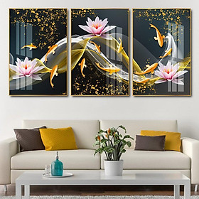 ✨Tranh treo tường tráng gương cá chép vàng & hoa sen hồng 3d decor trang trí cầu thang, phòng ngủ và phòng khách bộ 3 bức