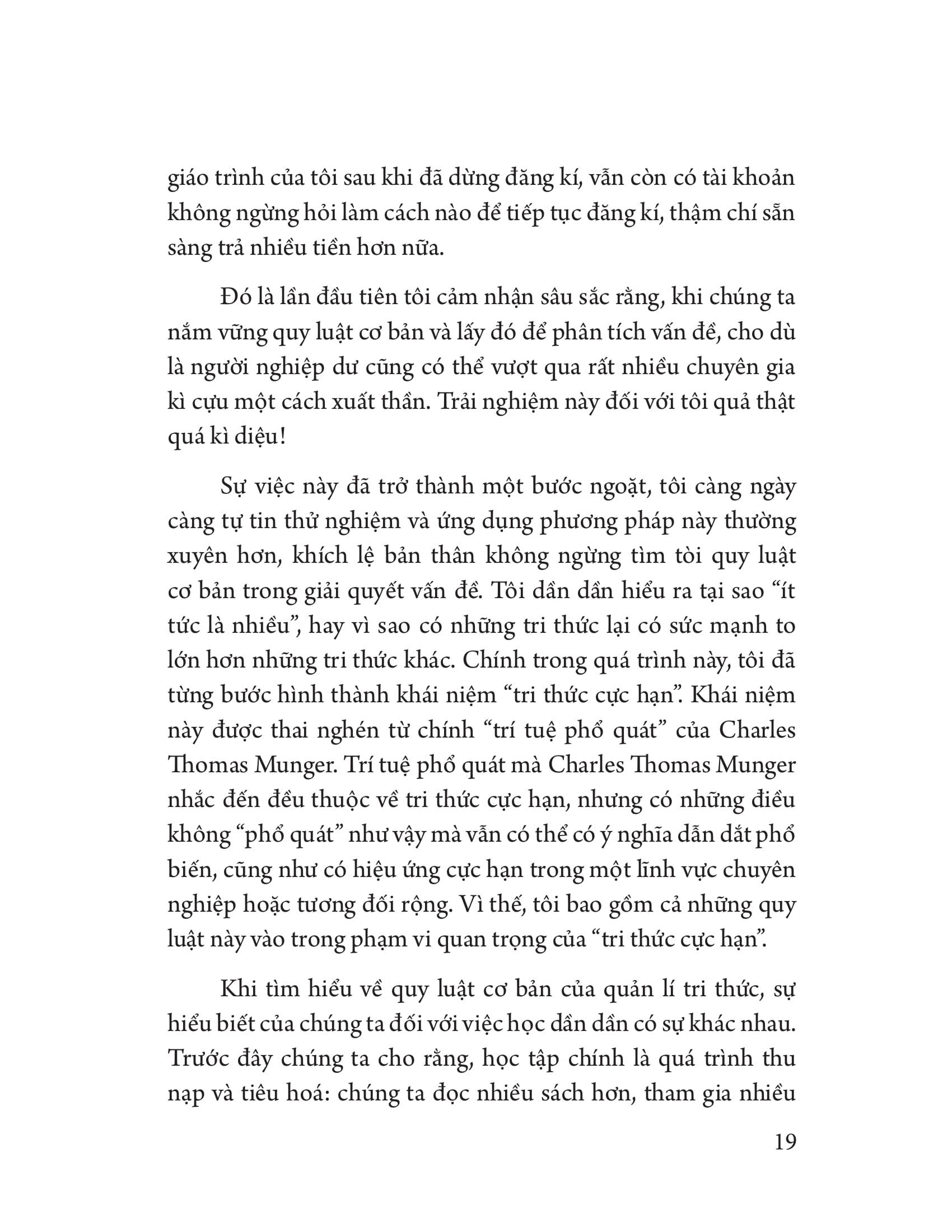 Theo quan điểm được chia sẻ trong cuốn sách “Tri thức cực hạn”, những thông tin có khả năng thay đổi hành vi, nhận thức của con người sẽ được coi là tri thức. Điều này cũng có nghĩa rằng bản thân bạn mới là người quyết định thông tin nào là tri thức và thông tin nào không thể tác động hay tạo nên sự khác biệt.