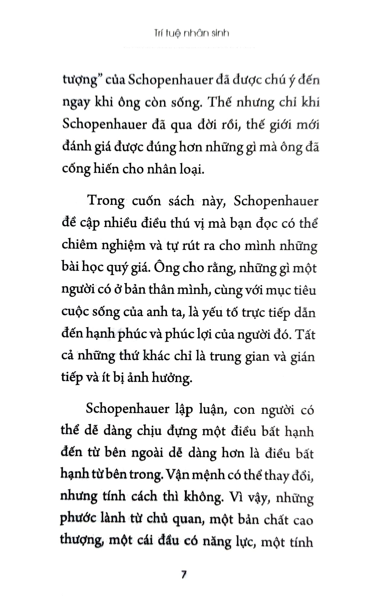 Mua tại TiktokTrí Tuệ Nhân Sinh GIỚI THIỆU TÁC GIẢ: Arthur Schopenhauer, một trong những triết gia vĩ đại của nước Đức, nổi tiếng với những quan điểm đầy sáng tạo và phản biện sâu sắc về cuộc sống và nhân sinh. Ông được biết đến với việc khuyến khích một lối sống đơn giản, khổ hạnh và chay tịnh, mặc dù trong cuộc sống cá nhân ông lại thích ăn thịt, uống rượu vang và mê mẩn phụ nữ. Schopenhauer đã mở rộng và phát triển triết lý Kant về cách con người trải nghiệm thế giới, đặc biệt là trong việc khám phá sâu sắc về bản chất của khổ đau và sự vô ích trong cuộc sống. Triết gia này không chỉ nổi tiếng với sự độc lập tư tưởng mà còn với sự dám nghĩ, dám nói và sự sâu sắc về tâm lý con người, tạo nên dấu ấn sâu sắc trong lịch sử triết học thế giới. GIỚI THIỆU TÁC PHẨM: TRÍ TUỆ NHÂN SINH – CUỘC DẠO CHƠI CỦA MỘT “ĐỘC CÔ” GIỮA CUỘC ĐỜI. Trí Tuệ Nhân Sinh của Arthur Schopenhauer là một tác phẩm triết học sâu sắc về hạnh phúc và ý nghĩa cuộc sống. Trong cuốn sách này, Schopenhauer đề cập nhiều điều thú vị mà bạn đọc có thể chiêm nghiệm và tự rút ra cho mình những bài học quý giá. Ông cho rằng, những gì một người có ở bản thân mình, cùng với mục tiêu cuộc sống của anh ta, là yếu tố trực tiếp dẫn đến hạnh phúc và phúc lợi của người đó. Tất cả những thứ khác chỉ là trung gian và gián tiếp và ít bị ảnh hưởng. Schopenhauer lập luận, con người có thể dễ dàng chịu đựng một điều bất hạnh đến từ bên ngoài dễ dàng hơn là điều bất hạnh từ bên trong. Vận mệnh có thể thay đổi, nhưng tính cách thì không. Vì vậy, những phước lành từ chủ quan, một bản chất cao thượng, một cái đầu có năng lực, một tính khí vui vẻ, tinh thần trong sáng, một thể chất khỏe mạnh, là những yếu tố đầu tiên và quan trọng nhất của hạnh phúc. “Đừng nên kỳ vọng nhiều vào người khác, hay nói chung là đừng nên kỳ vọng từ thế giới bên ngoài” – như một châm ngôn đúng với bất kỳ ai! Chính bản thân mình là nguồn gốc của những điều tốt đẹp nhất mà con người có thể đạt được. Càng đúng hơn khi khẳng định – một người càng vui vẻ hạnh phúc hơn khi tìm thấy nguồn vui trong chính mình.