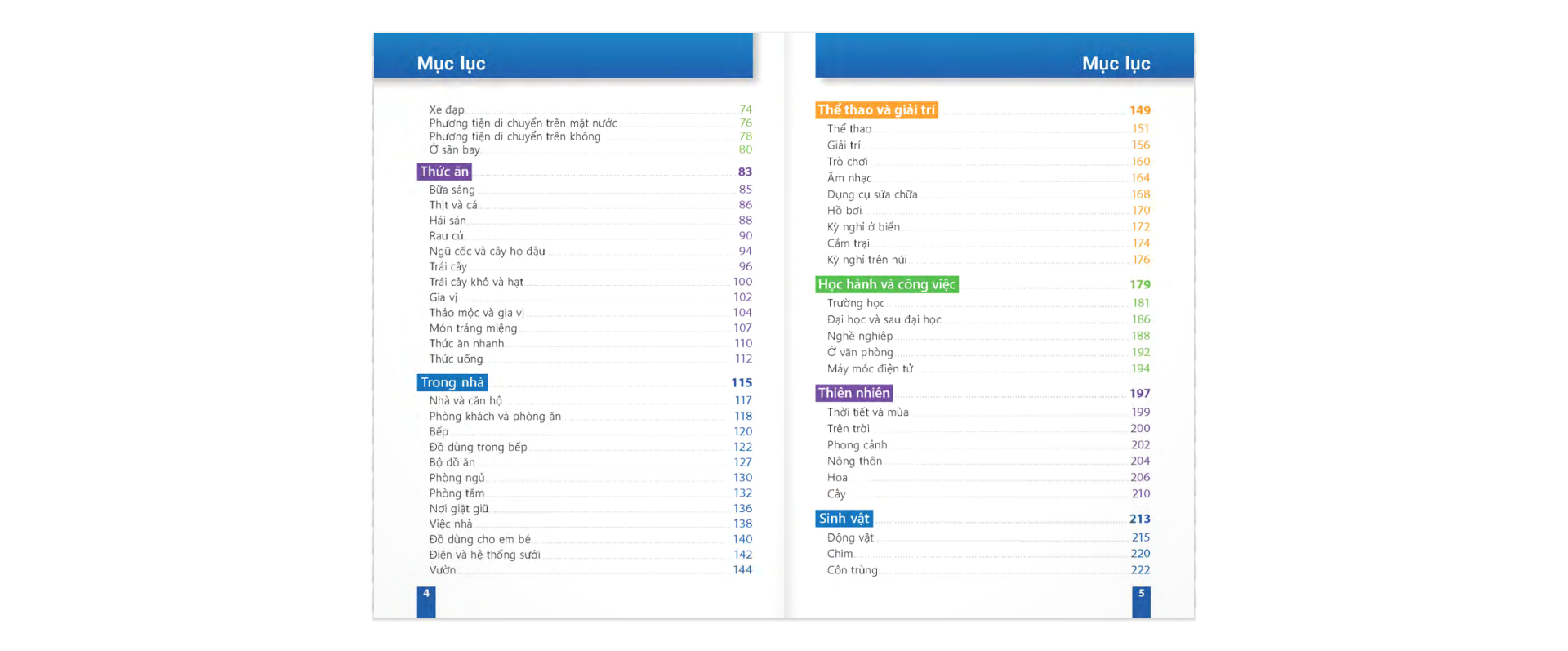 Được thiết kế để hỗ trợ bạn trong các chuyến du lịch, sách có kích thước nhỏ gọn, dễ mang theo, bao gồm 11 chương, cung cấp 1.800 hình thuộc những chủ đề liên quan đến cuộc sống hằng ngày như: tình huống khẩn cấp, mua sắm, đi lại, ăn uống, thể thao, giải trí…