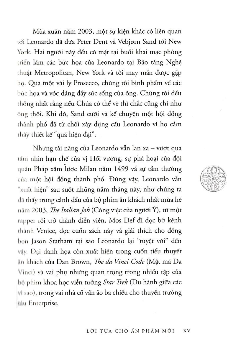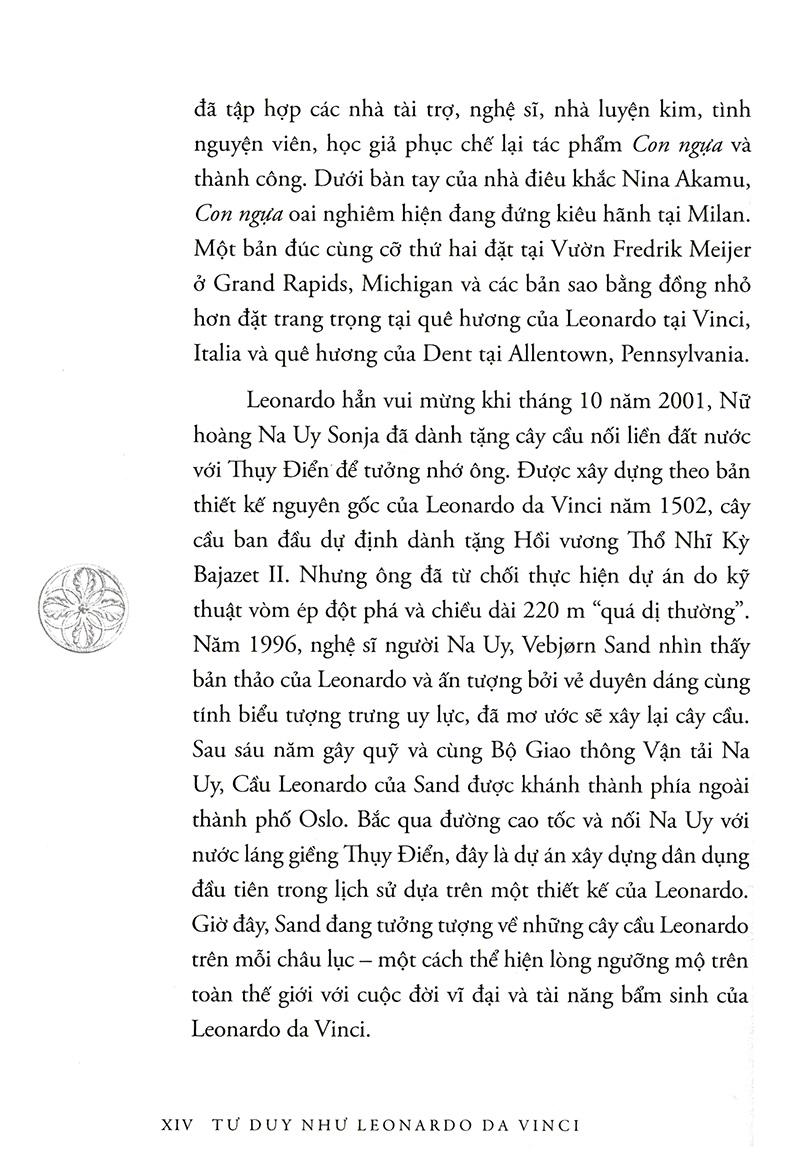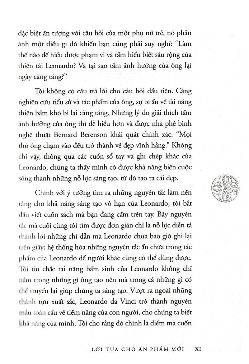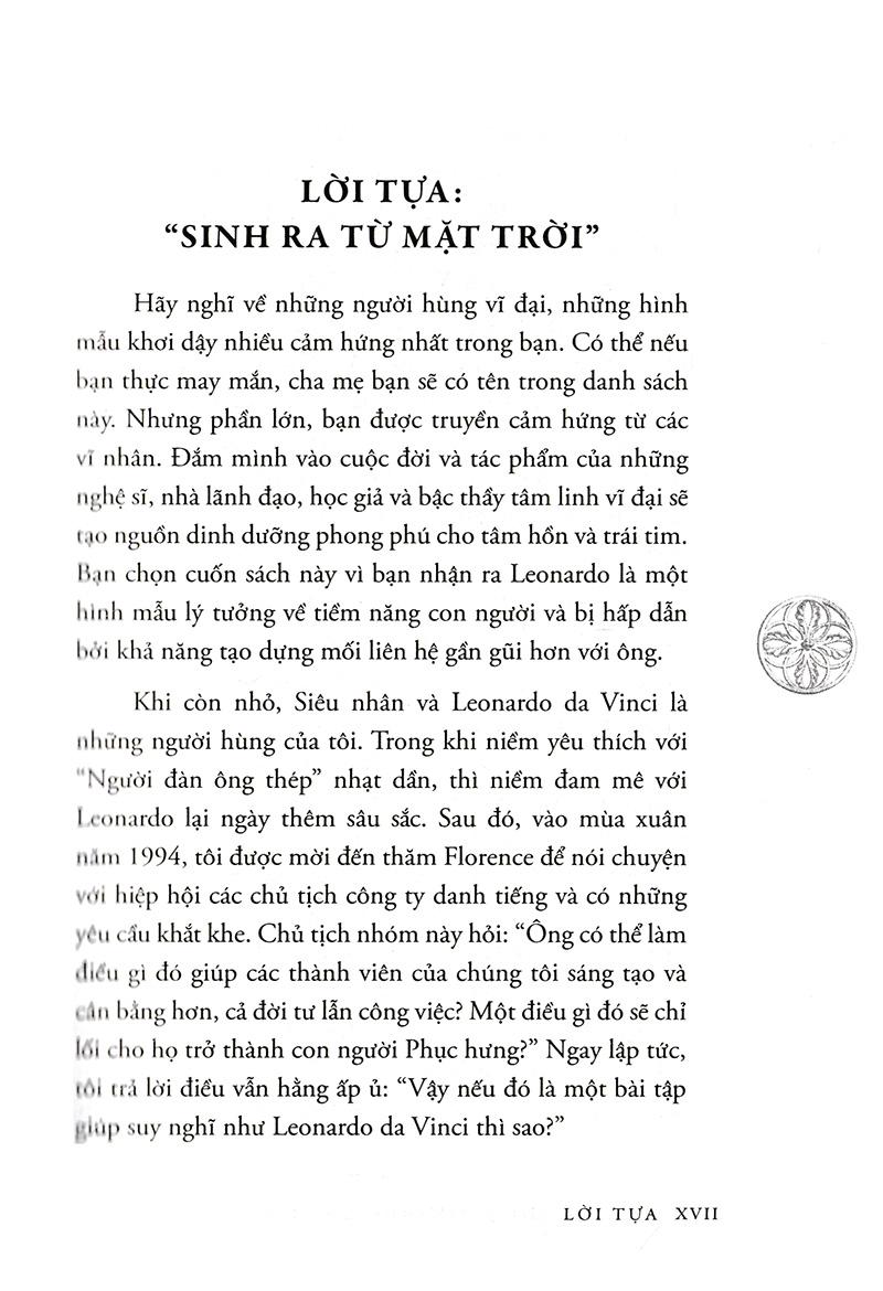 Tư Duy Như Leonardo Da Vinci Tư duy như Leonardo da Vinci là cuốn sách kỹ năng giúp bạn có thể khám phá khả năng tiềm ẩn của m.ình, mài sắc nó và giải phóng trí thông minh bằng cách thực hiện theo những cách mà thiên tài lớn nhất mọi thời đại Leonardo da Vinci đã làm. Năng lực tư duy sáng tạo là tốc độ tư duy, khả năng chuyển hóa thông tin thành kiến thức, và từ kiến thức tạo ra giá trị, tạo ra sản phẩm, dịch vụ. Với thế hệ trẻ nói chung và thế hệ trẻ Việt Nam nói riêng, năng lực tư duy sáng tạo đã trở thành một trong những điều kiện cần thiết để đem lại cho họ một công việc hứa hẹn, hay xa hơn nữa là một chỗ đứng vững chắc trong xã hội và trên thế giới. Do đó, ngay từ khi còn ngồi trên ghế nhà trường, mỗi người đều đã phải tự chuẩn bị và tạo dựng cho m.ình năng lực tư duy sáng tạo, coi nó như là hành trang để bước vào đời. Leonardo da Vinci (1452 - 1519) là một thiên tài toàn năng người Italia: là họa sĩ, kiến trúc sư, nhà điêu khắc, nhà khảo luận mỹ thuật, thiên tài của nền văn hóa và chủ nghĩa nhân đạo thời Phục hưng, xuất chúng trong mọi hình thái nghệ thuật, hơn nữa, còn là nhạc sĩ, nhà toán học kiêm kỹ sư cơ khí, triết gia, bác sĩ, nhà giải phẫu, người đi đầu trong rất nhiều lĩnh vực phát minh khoa học sau này. Leonardo da Vinci là một thiên tài lớn. Ông có năng lực tư duy sáng tạo vô hạn. Tuy nhiên, thiên tài là do học tập chứ không phải tự nhiên mà có. Loài người đã được trao tặng nhiều tiềm năng vô hạn để học tập và sáng tạo. Bạn có thể khám phá khả năng tiềm ẩn của m.ình, mài sắc nó và giải phóng trí thông minh bằng cách thực hiện theo những cách mà thiên tài lớn nhất mọi thời đại Leonardo da Vinci đã làm. Trong Tư duy như Leonardo da Vinci, thông qua các bản vẽ sáng chế, và các công trình nghệ thuật huyền thoại của Da Vinci, Gelb giới thiệu Bảy nguyên tắc Da Vinci, những yếu tố cốt lõi và quan trọng của thiên tài từ curiosità (trí tò mò), cách tiếp cận trí tò mò vô hạn đến với cuộc sống để connessione (kết nối), sự đánh giá cao cho sự liên kết của tất cả mọi thứ. Da Vinci là nguồn cảm hứng của bạn và bạn sẽ khám phá một cách tư duy hoàn toàn mới. Hãy thực hiện từng bước một thông qua các bài tập và bài học, bạn sẽ khai thác được thế mạnh và những điều kỳ diệu tuyệt vời từ chính bạn, làm chủ cuộc đời và tận dụng khả năng để: