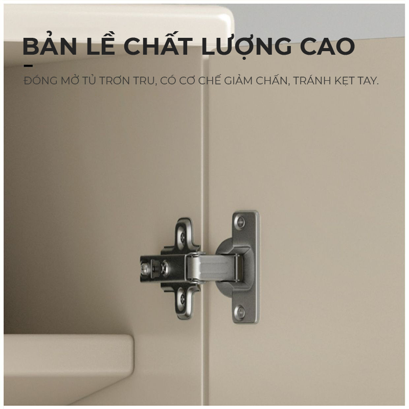 Chất liệu làm từ gỗ MFC, bề mặt phủ Melamine chống thấm, dễ dàng lau chùi Khung tủ màu nâu sẫm vân gỗ walnut kết hợp cánh tủ màu trắng hài hòa Thiết kế thông