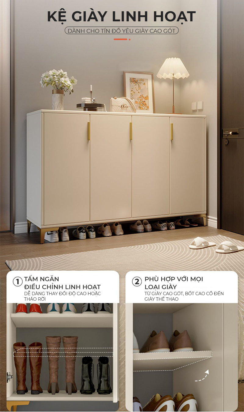 - Kích thước: - Tủ 2 cánh : Dài 60cm, Rộng 32cm, Cao 92cm. - Tủ 4 cánh : Dài 120/140cm, Rộng 32cm, Cao 92cm. - Chất liệu: Gỗ MDF phủ melamin chống xước chống nước dễ dàng vệ sinh. - Phong cách: Hiện Đại - Công năng: Sử dụng để cất giày dép tại căn hộ, tại văn phòng, tại quán cafe, tại shop spa salon vô cùng thích hợp. - Cấu tạo: Lắp ráp