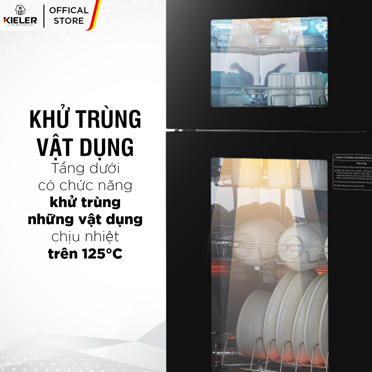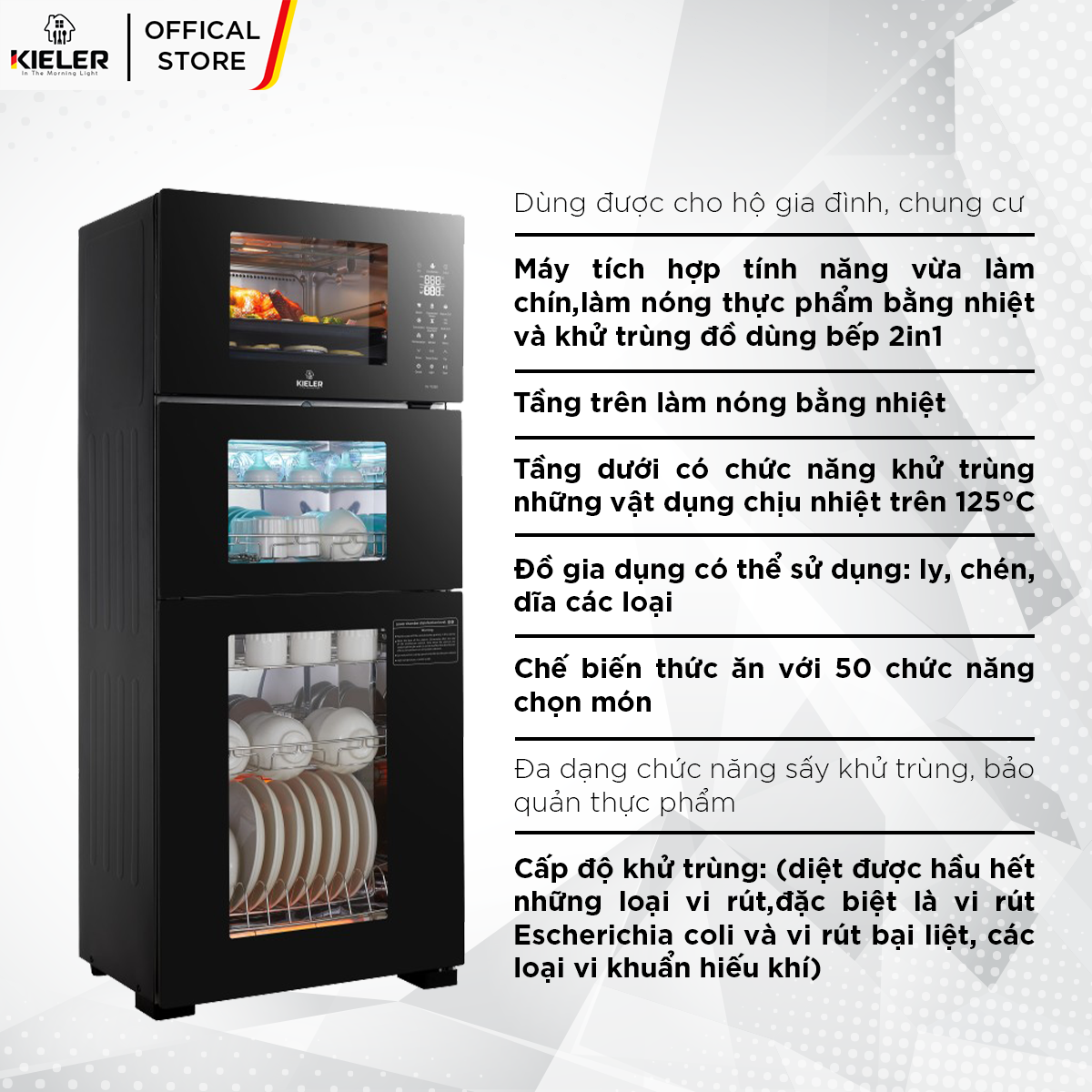 - Tủ khử trùng Kieler KL-TL520 2 in 1 là giải pháp đa năng cho việc làm chín và làm nóng thực phẩm bằng hơi nước và khử trùng đồ dùng bếp.