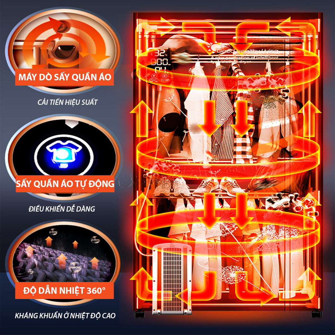 ĐẶC ĐIỂM NỔI BẬT: - Công dụng: làm khô nhanh quần áo, loại bỏ mùi hôi khó chịu, bụi bẩn trên quần áo. - Sử dụng bộ phát điện ổn định PTC, tiết kiệm điện. -
