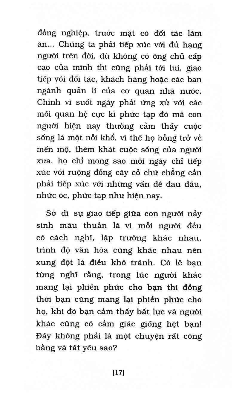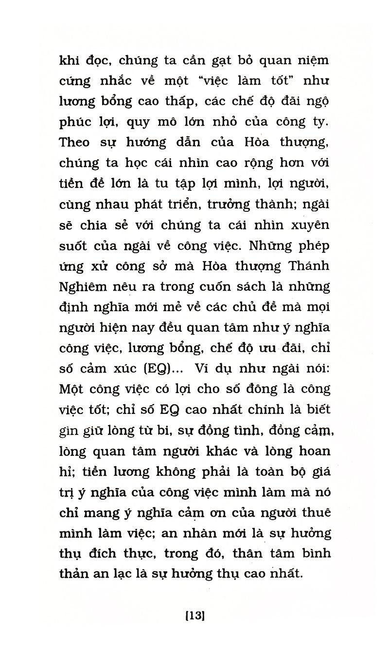 Trong cuốn sách này, Hòa thượng Thích Thánh Nghiêm chia sẻ về việc ứng dụng trí tuệ của giáo lí Phật giáo vào đời sống, nói rõ cho chúng ta biết về ý nghĩa của công việc, nghệ thuật làm việc, phương pháp ứng xử trong giao tiếp cũng như một số nguyên tắc hợp tác đoàn thể, đề xuất quan điểm tìm việc theo tinh thần “tùy thuận nhân duyên” để giảm bớt áp lực trong quá trình tìm kiếm việc làm, lấy “cạnh tranh lành mạnh” thay thế cho cạnh tranh một mất một còn mang đậm “động vật tính”; lấy “nghệ thuật chỉnh dây đàn” theo tinh thần trung không rơi vào cực đoan để giữ thăng bằng tâm lí trong cuộc sống. Cuối cùng, Ngài còn đưa ra sáu nguyên tắc chung sống hòa thuận, đó cũng là những nguyên tắc đã giúp đức Phật “thống lí đại chúng (thống lĩnh và quản lí đại chúng) thích hợp.”