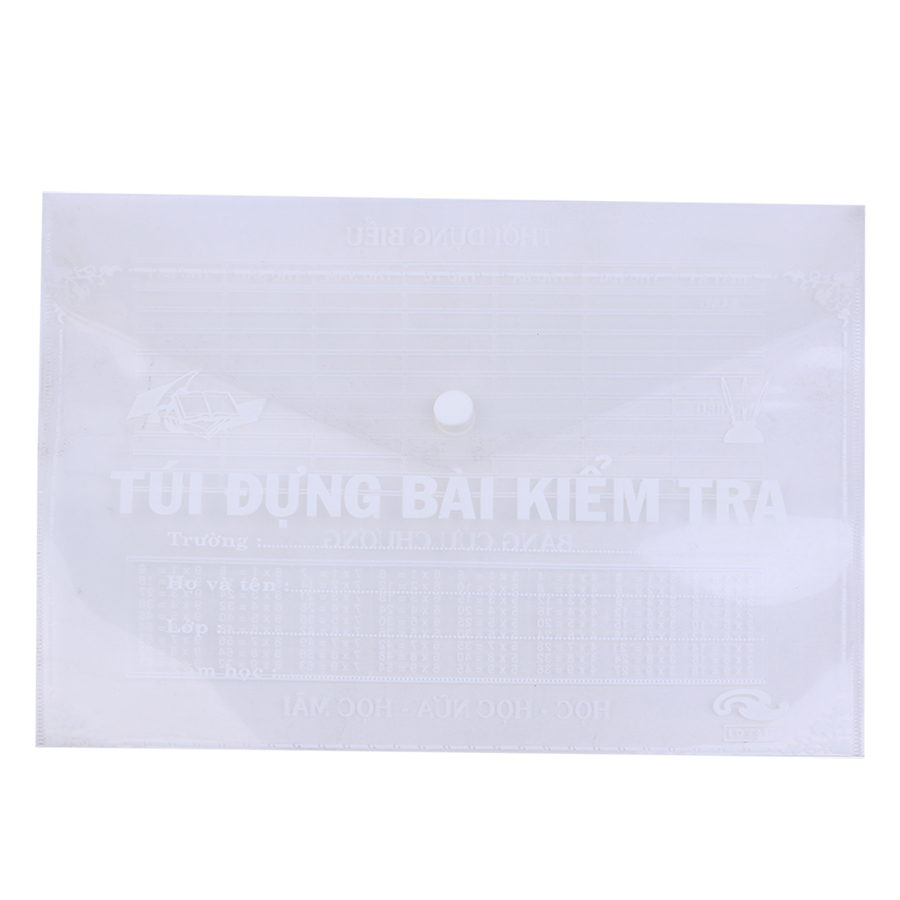 - Túi Bài Kiểm Tra (10 Cái / Lốc) được làm từ nhựa dẻo có độ bền cao, an toàn cho sức khỏe người sử dụng. Khóa bấm chắc chắn, dễ dàng đóng mở giúp bạn