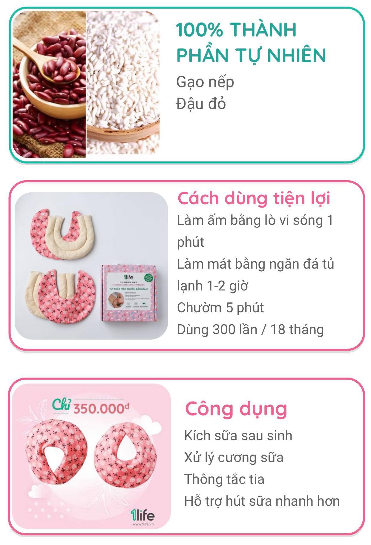 Mua tại TiktokCông dụng: Kích sữa sau sinh Giảm tắc tia sữa Giảm đau, viêm bầu ngực Giảm thời gian bơm sữa 3 cách áp dụng: Liệu pháp nóng: giảm tắc tia, căng cứng, kích sữa xuống nhanh Liệu pháp lạnh: giảm đau buốt , hoặc sau khi cho bé bú Hỗ trợ bơm sữa với máy: có thể sử dụng với máy bơm điện hoặc máy bơm tay, làm kích sữa xuống nhanh, giảm thời gian bơm sữa 100% thành phần tự nhiên: gạo nếp và đậu đỏ