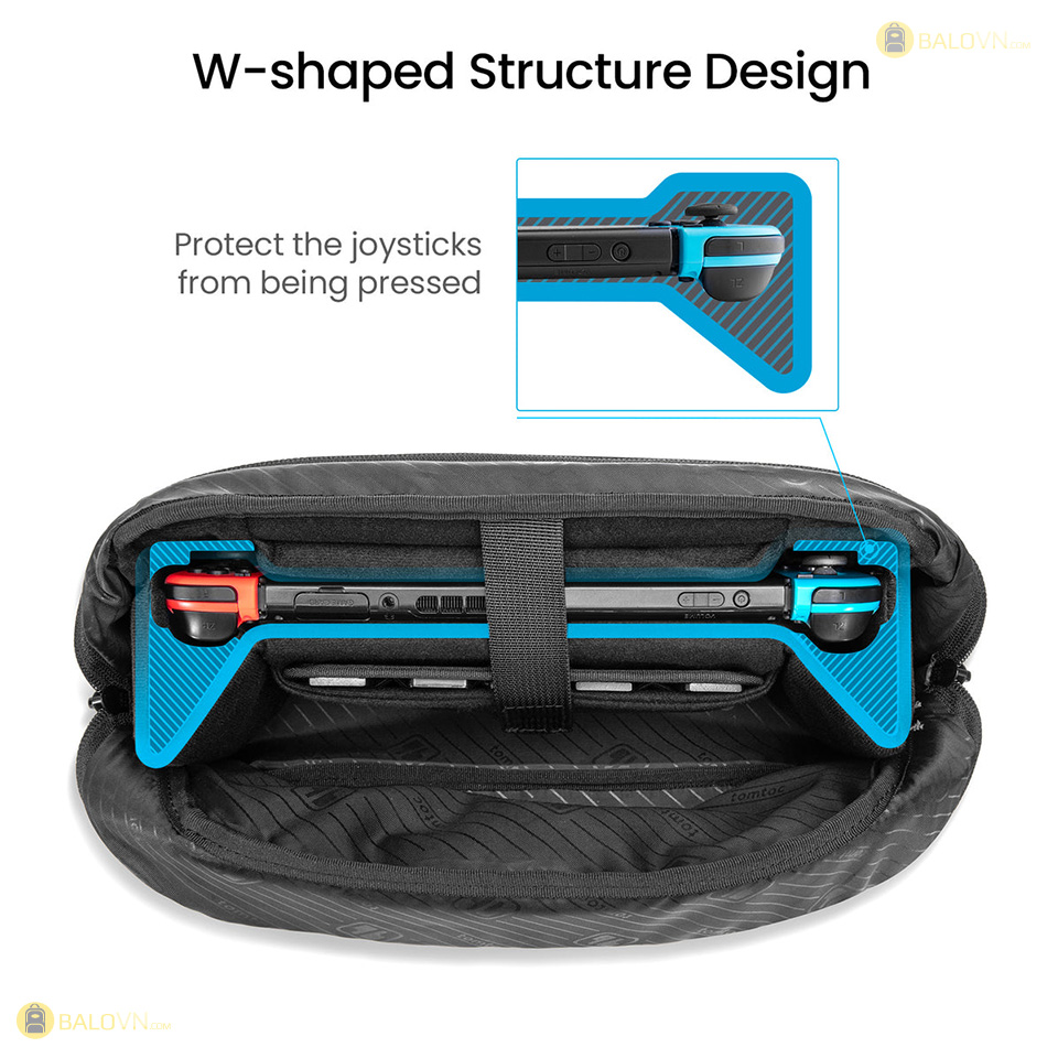 Thiết kế cấu trúc hình chữ W Tomtoc đã thiết kế một tấm chắn cấu trúc hình chữ W cho túi bảo vệ, với lớp đệm dày trong túi để ngăn bàn điều khiển bị bóp. Không gian rộng rãi ở cả hai bên ngăn không cho phím điều khiển bị nhấn.
