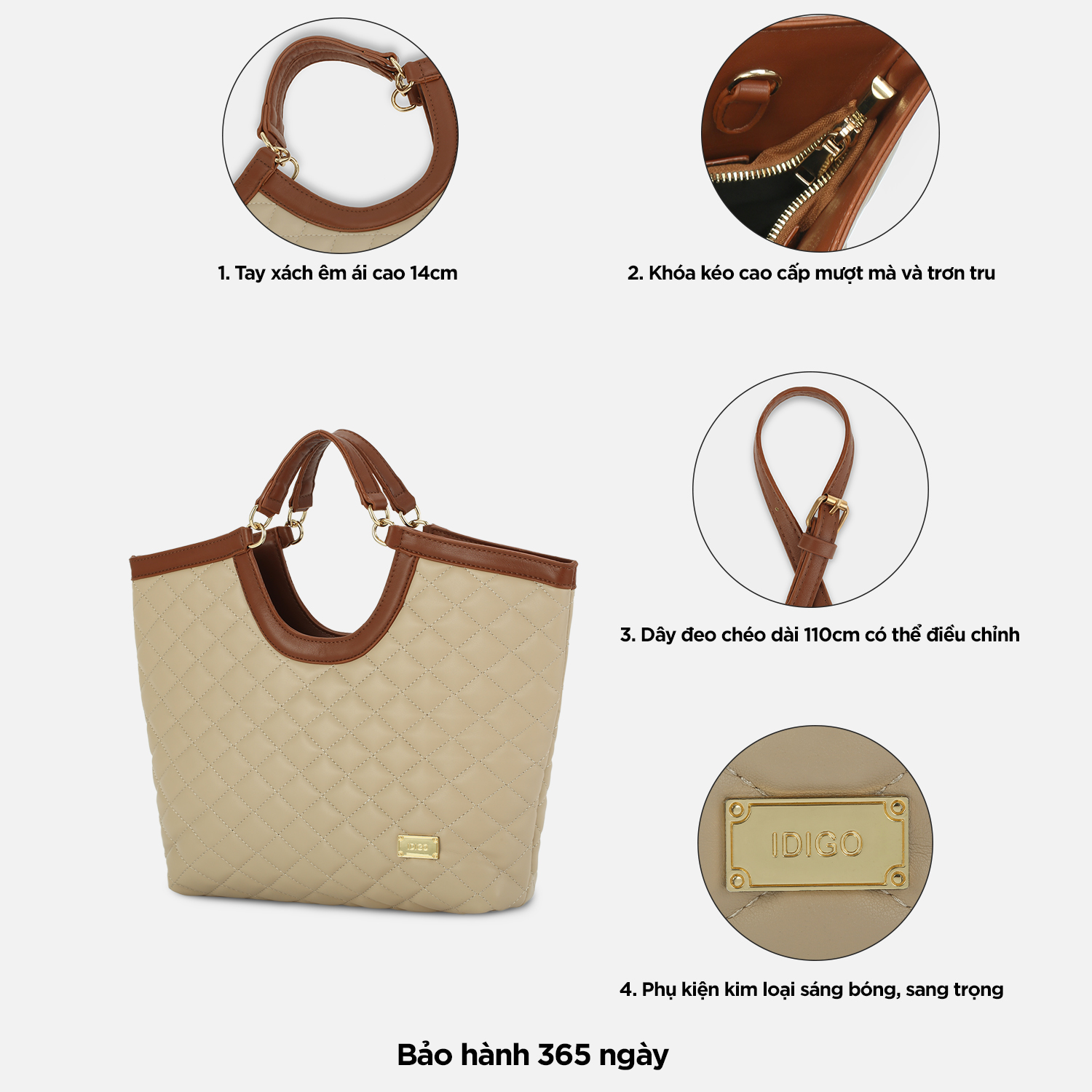 Chiếc Túi xách tay công sở, túi đeo chéo nữ chần trám dạo phố phong cách hàn quốc với thiết kế dáng hình thang cùng chi tiết chần trám lạ mắt tạo nên một phong cách vừa thanh lịch, lại rất hiện đại và tao nhã, ắt hẳn sẽ khiến cho các bạn siêu lòng ngay từ ánh nhìn đầu tiên. Túi xách tay công sở, túi đeo chéo nữ chần trám dạo phố phong cách hàn quốc này thích hợp cho cho các bạn mang đi làm, đi chơi, du lịch hay dạo phố, cà phê cùng bạn bè... - Kích thước: 29 x 7.5 x 27.5 x 40cm (Dài đáy x Rộng x Cao x Dài miệng) - Kích thước chiều cao có thể kéo khoá: 18cm - Màu sắc: Đen, Be, Kem, Nâu đậm - Chất liệu: Da tổng hợp - Trọng lượng: 460 gram - Xuất xứ: Trung Quốc - Số ngăn: 1 chính, 1 phụ nhỏ bên trong, 1 kéo nhỏ bên trong - Chiều cao quai xách tay: 14cm - Chiều dài dây đeo chéo: 110cm (có khoá thâu tăng giảm độ dài) - Cách đeo: (1) đeo chéo (2) đeo vai (3) xách tay Gam màu thanh lịch, bền màu với thời gian, đường may chắc chắn. Chất liệu da tổng hợp có độ mềm vừa đủ tạo nên phom dáng túi, vừa có độ đàn hồi, vừa chống thấm nước nhẹ, bền đẹp và dễ dàng vệ sinh. Phom túi hình thang với chất liệu da có độ mềm vừa phải giúp túi hạn chế bị cong vênh, nhăn gãy khi sử dụng. Bên trong túi có 1 ngăn chính thích hợp đựng máy tính bảng từ 10.5inch trở xuống, điện thoại, ví tiền (Có thể để tài liệu A4 trong trường hợp không kéo khoá)… Ngoài ra bên trong túi còn có 1 ngăn phụ nhỏ đựng các loại giấy tờ tuỳ thân, thẻ xe cùng 1 ngăn kéo nhỏ để được chìa khoá, mỹ phẩm… rất thích hợp sử dụng để đi làm, đi chơi, du lịch hay dạo phố. Túi có khóa kéo cao cấp hoạt động mượt mà và trơn tru, dây kéo bền & chắc chắn. Đặc biệt, luân phiên xách tay với quai xách cố định cao 14cm hoặc đeo chéo/đeo vai với dây da dài 110cm giúp thay đổi phong cách. Sản phẩm túi xách này được IDIGO đặt sản xuất tại nhà máy Trung Quốc và nhập khẩu chính ngạch về Việt Nam, có thông tin sản phẩm nhập khẩu in rõ ràng trên tem nhãn.