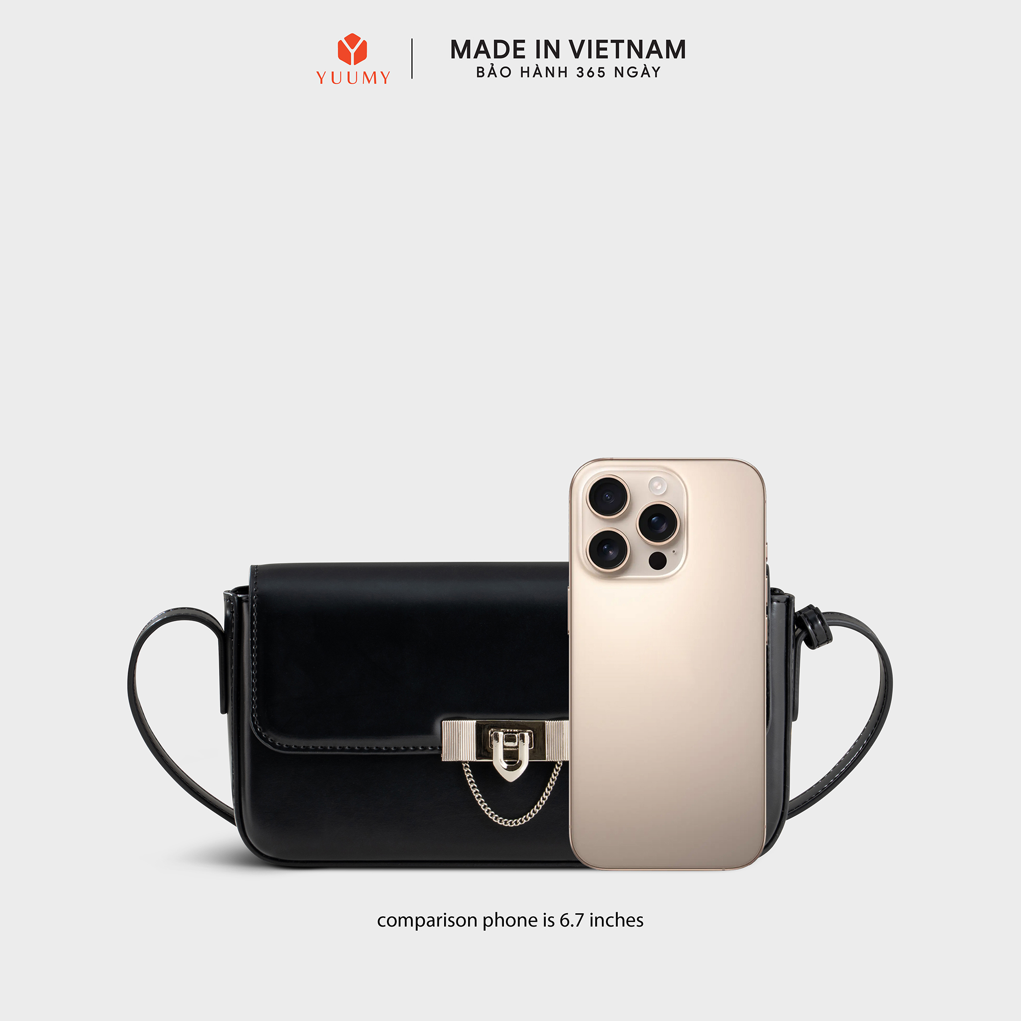 Túi đeo chéo da Yuumy Glossy YN303 với form hộp nhỏ gọn, bo góc mềm mại và đường chỉ may chia ô đối xứng, sản phẩm tạo cảm giác chỉn chu và thời trang trong