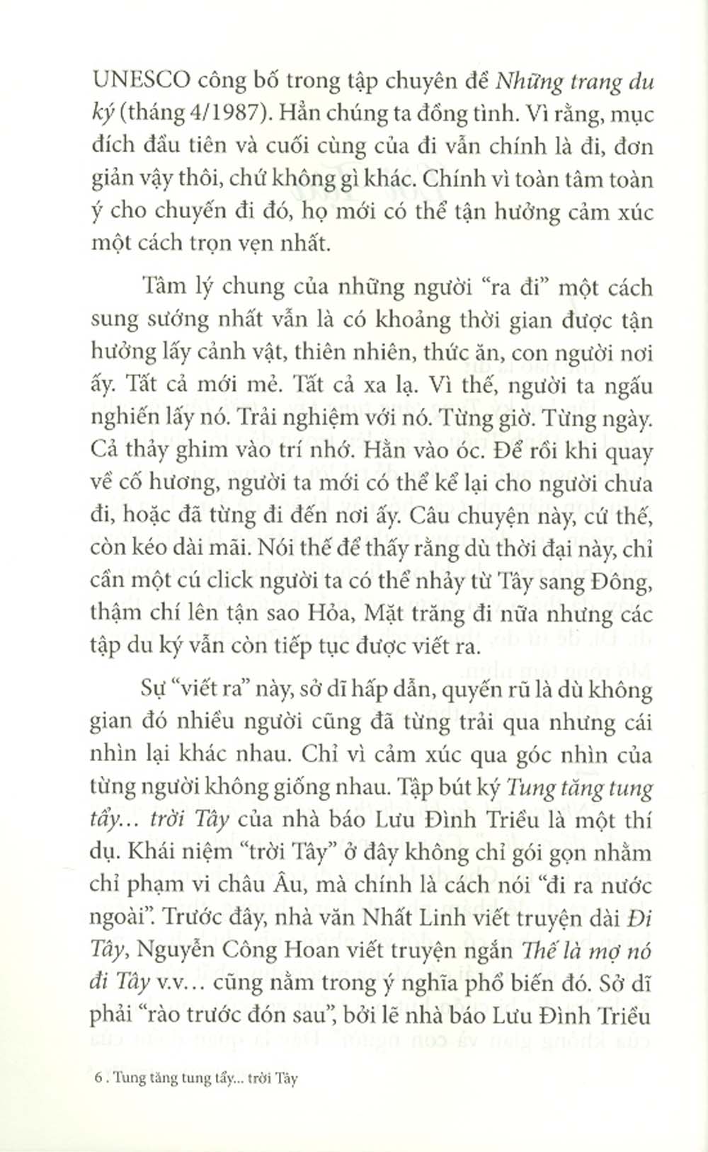 Mua tại TiktokTập bút ký "Tung tăng tung tẩ trời Tây" của nhà báo Lưu Đình Triều không chỉ miêu tả cảnh vật, danh lam thắng cảnh, công trình văn hóa nghệ thuậ anh còn ghi nhận tâm lý, tính cách của con người nơi ấy. Đó chính là "máu nghề nghiệp" của nhà báo khi truyền tải một thông tin, không chủ quan, võ đoán mà còn tiếp cận câu trả lời của người dân bản địa. Với nhà báo, khi du lịch không chỉ đi để đi, mà còn là dịp quan sát, nhận xét và ghi ché