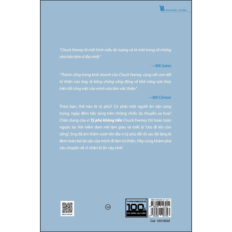 Cuốn Tỷ phú không tiền là tiểu sử về Chuck Feeney, tường thuật lại những sóng gió ông và các cộng sự trải qua trên thương trường để kiến tạo nên một đế chế bán lẻ hùng mạnh, cũng như những nỗ lực của ông trong việc đem toàn bộ gia sản đi làm từ thiện. Trong sách cũng có một chương kể về những hoạt động tài trợ của Chuck Feeney tại Việt Nam bao gồm việc hợp tác với tổ chức Đông Tây Hội Ngộ, hay tài trợ cho trường RMIT. Tác giả cũng nhấn mạnh tầm ảnh hưởng của Feeney trong việc khuyến khích các tỷ phú trên thế giới như Bill Gates và Warren Buffett cho đi khi còn sống.