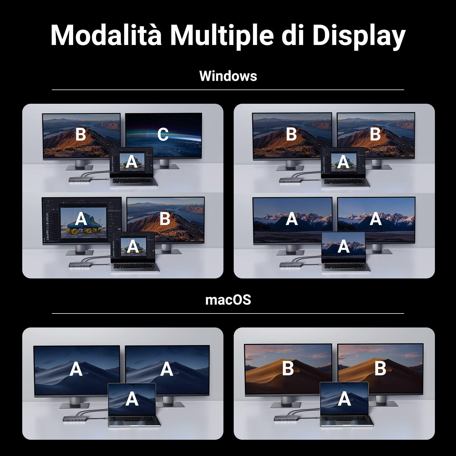 1. Đầu vào: USB Loại C 2. Đầu ra: 1*USB-A 3.0Female, 2*USB-A3.2, 1*USB-C 3.2,2*HDMI, 1*RJ45 Gigabit, 1*TF slot, 1*SD slot, 3.5mm, PD 3. HDMI 1 (màn hình ngoài đơn): Lên đến 4K@60Hz 4. HDMI 2