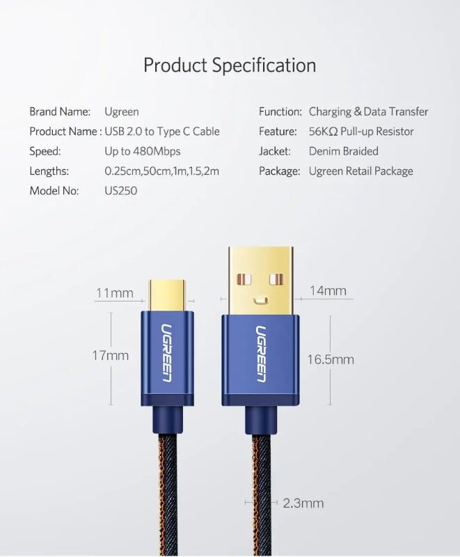 Ugreen 60128 2M Usb To Usb Type C Data Cable Aluninum Case Us288 1. Features: Charging cable, data transmission. 2. Cable length: 2M 3. Color: Gray 2. Input: USB 2.0 3. Output: USB-C 4. Compatible