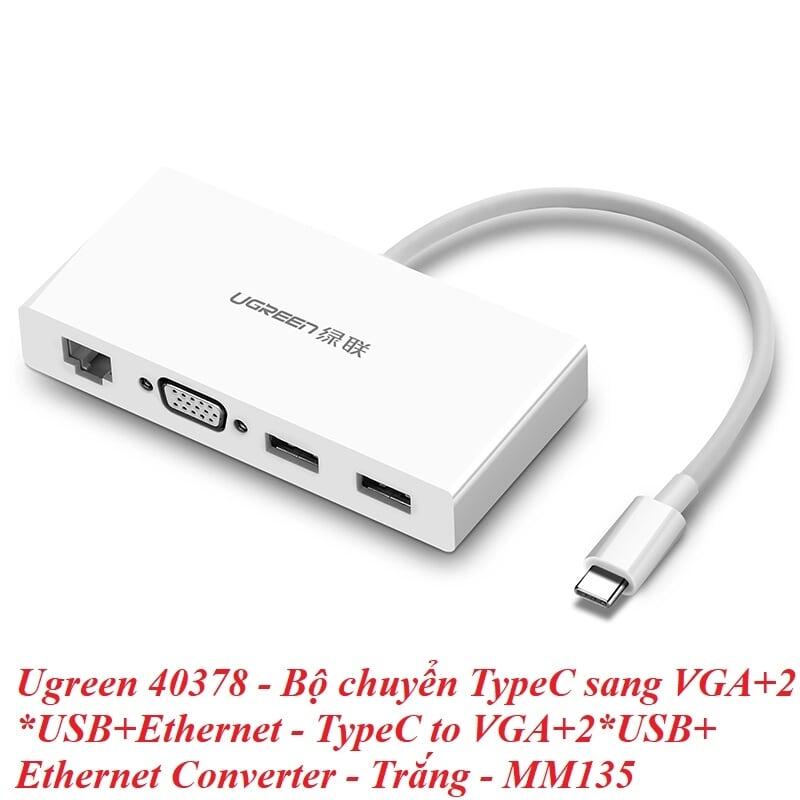 Ugreen 40378 type c to vga dual usb ethernet converter trắng mm135 1. Features: Convert USB-C to VGA Full HD + 2 USB 3.0 ports + 1 Lan 10 / 100Mbps port. 2. Cable length:
