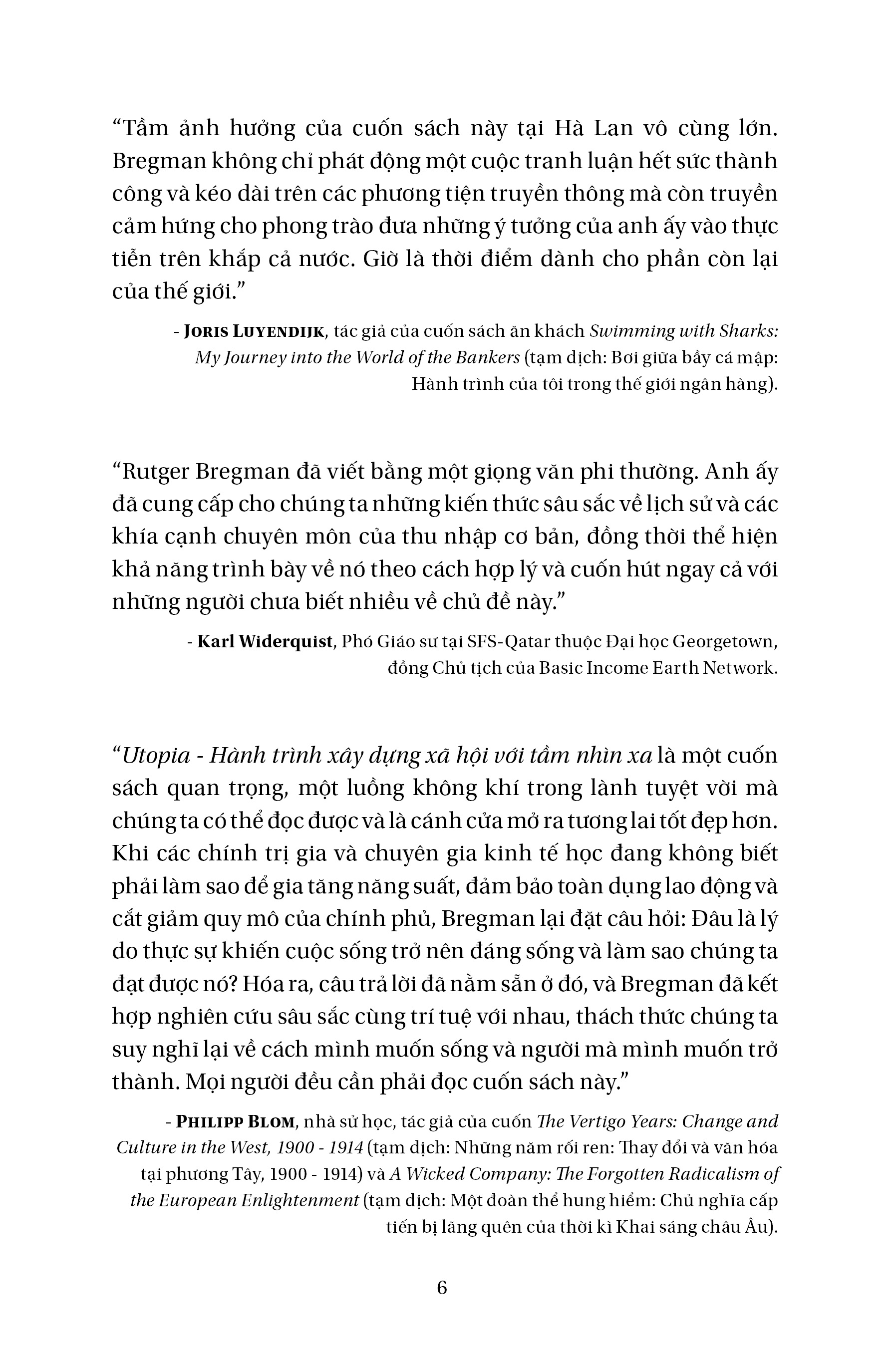 Ngày nay, khi khoảng cách giàu nghèo, khoảng cách giữa công việc lý tưởng và công việc thực tế ngày càng bị kéo dãn, thì ba ý tưởng này đã sắp xếp lại nguồn lực của từng cá nhân, của xã hội và của cả thế giới. Vấn đề thu nhập cơ bản cho toàn dân không còn là giấc mơ, mà trở thành thực nghiệm xã hội đang được tiến hành tại một số quốc gia tiến tiến ở châu Âu, trong cuốn sách cũng đưa ra các ví dụ điển hình đã thực hiện thành công (như Canada, Phần Lan, Hà Lan, Thụy Sỹ) Đối diện với sự biến động và bất công của thế giới hiện tại, khi mà chính phủ hoặc các chính đảng cũng không thể hứa hẹn hay đảm bảo tương lai cho người dân, thì Bregman dẫn dắt độc giả đến với luồng tư tưởng mới: Phát triển là gì? Tiến bộ là gì? Giá trị đích thực của cuộc sống là gì?