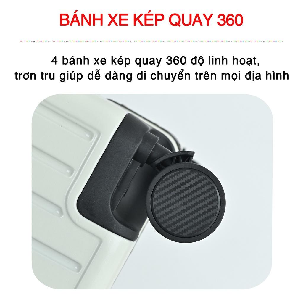 • Bánh xe: xoay 360 độ giúp vali luôn dễ dàng kéo đẩy, không gây tiếng ồn khi di chuyển, không bị mài mòn
