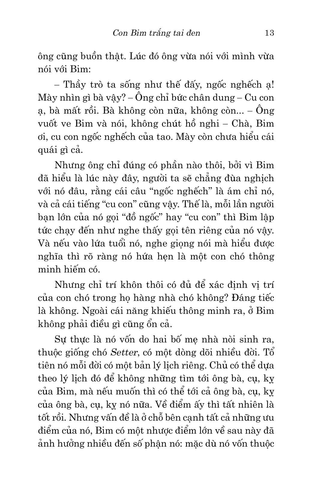 Trên thế giới đã có rất nhiều tác phẩm cảm động viết về chó, một loài vật thân thiết và gần gũi với con người. Tuy nhiên, có sức lay động như Con Bim trắng tai đen thì không tác phẩm nào sánh được, cho dù đó là Tiếng gọi của Hoang Dã, Nanh trắng hay Chó hoang Dingo. Hàng triệu độc giả đã khóc khi đọc tác phẩm này và không ít người sau đó đi lượm những con chó bơ vơ không chủ đem về nhà nuôi rồi đặt tên là Bim để tưởng nhớ tới chú chó săn bất hạnh. Chính vì thế, bài thơ bằng văn xuôi ca ngợi lòng thủy chung và sự tận tụy này được liệt vào một trong những tác phẩm đặc sắc của văn học thế kỉ XX.