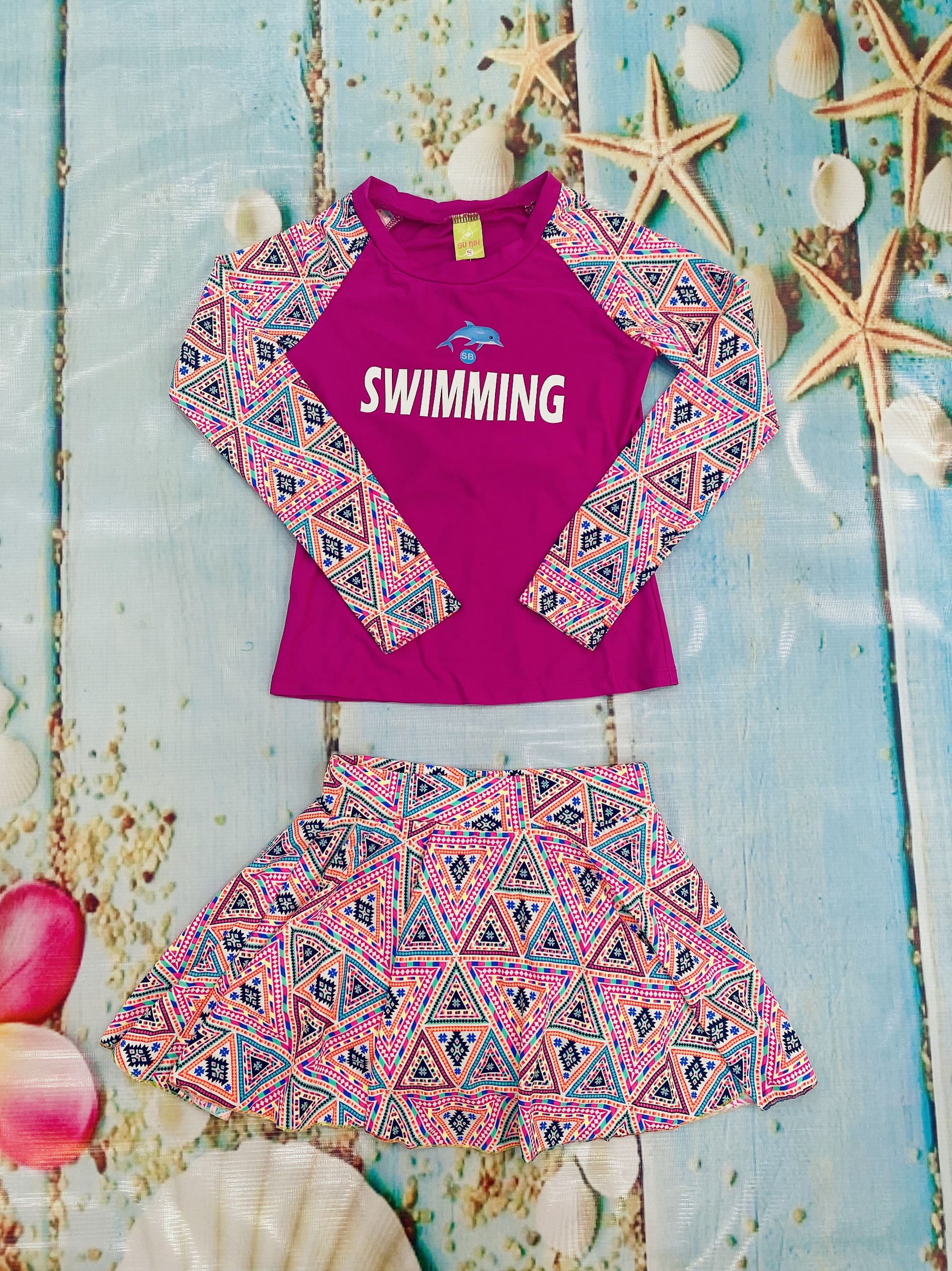 - Mẫu đồ bơi mới nhất cho các bạn nữ thích sự trẻ trung kín đáo mà vẫn thu hút khi đi biển, đi bơi. - Áo dáng ngắn tay phối hoạ tiết trẻ khoẻ,