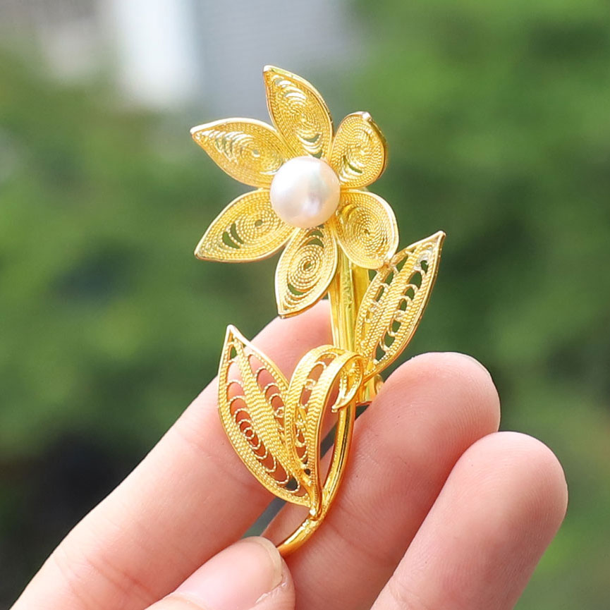 Một bông hoa cài áo mạ vàng không chỉ là phụ kiện điểm xuyết cho trang phục mà giống như món trang sức sang trọng thể hiện đẳng cấp quý cô, góp phần tôn vinh vẻ đẹp người phụ nữ hiện đại.