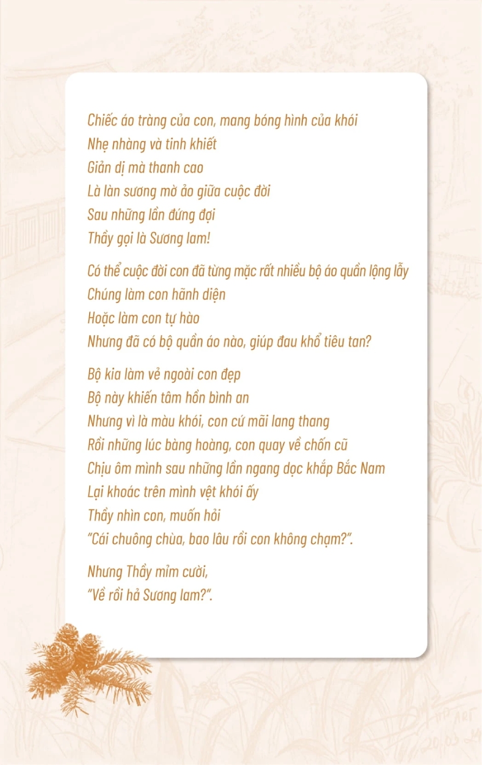 Tác giả muốn nói với các bạn rằng, vẫn còn một nơi thật sự bình yên luôn chờ đón các bạn trở về, vẫn có những con người thầm lặng mang trong mình một trái tim bao dung luôn dịu dàng che chở. Có thể là gia đình, người thân có thể bạn bè, và cũng có thể là những vị Thầy đang ẩn mình đâu đó trong những ngôi chùa mà các bạn vô tình bắt gặp trên hành trình vạn dặm.