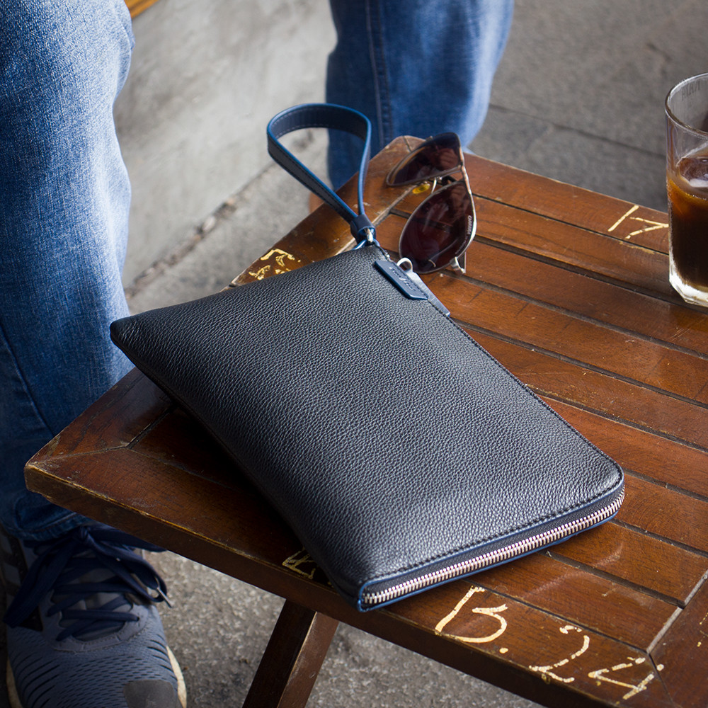 VÍ NAM CẦM TAY KHÓA KÉO-LRB-220013-A-NAV Thiết kế ví cầm tay sang trọng, lịch lãm từ thương hiệu Valentino Creations. Chất liệu: da bò cao cấp Kích thước: 19 x 30 x 3 cm
