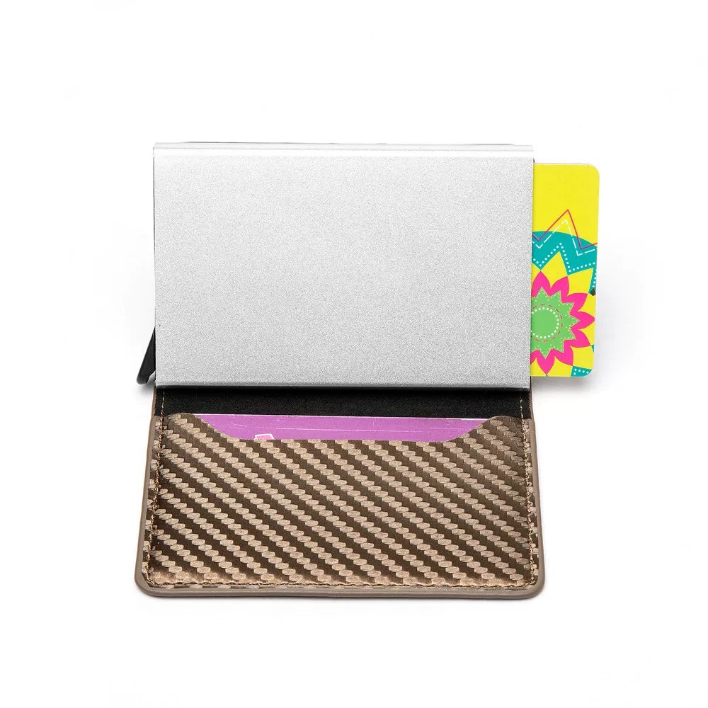 - Chất liệu của bóp ví: làm từ chất liệu da phủ vải denim, hộp đựng thẻ bằng hợp kim nhôm, bóp vô cùng chắc chắn, gọn nhẹ khi cầm trên tay