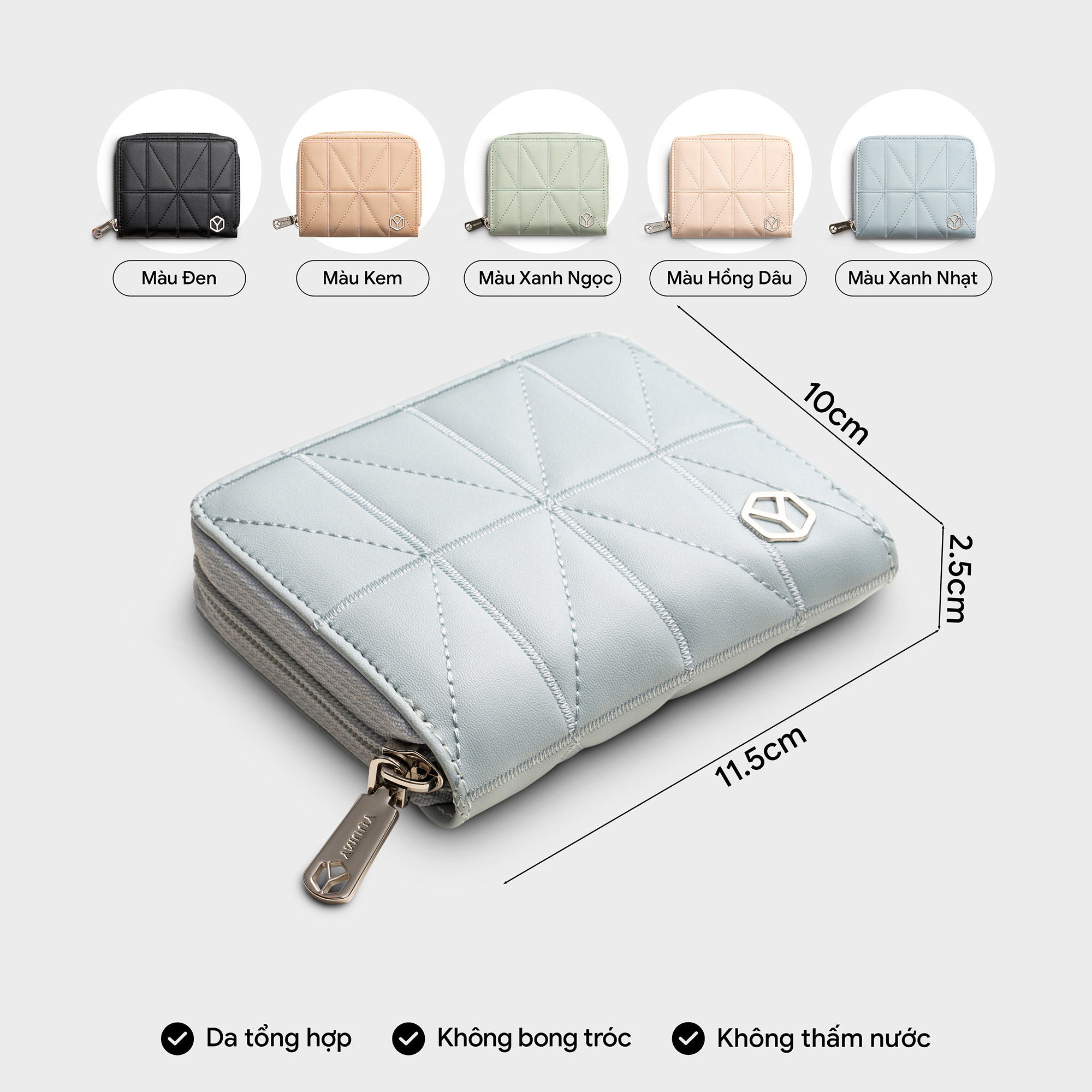 • Form: 3 Side Zip Square Wallet • Size: 13cm x 9cm x 1.5 cm • Màu sắc: SOUTH BEACH • Chất liệu: 100% Polyester • Kỹ thuật: Screen Printing • Xuất xứ: Việt Nam