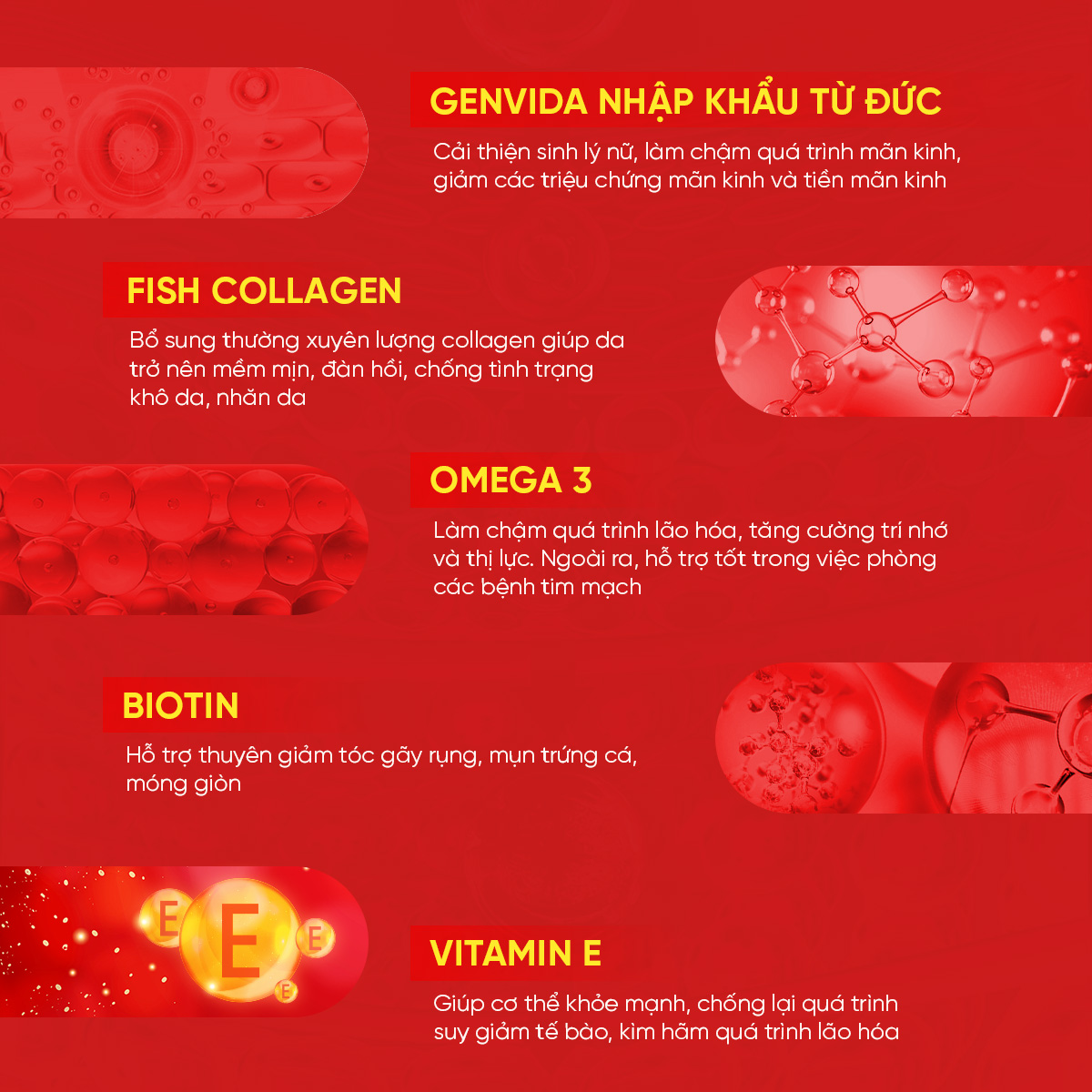 Genivida: nhập khẩu từ hãng dược nổi tiếng DSM - Thụy Sĩ, được các chuyên gia hàng đầu trên thế giới công nhận hiệu quả vượt trội trong việc cải thiện các triệu chứng: khô hạn, giảm ham muốn, khó ngủ, bốc hỏa, căng thẳng, loãng xương, bệnh tim mạch... cho phụ nữ.